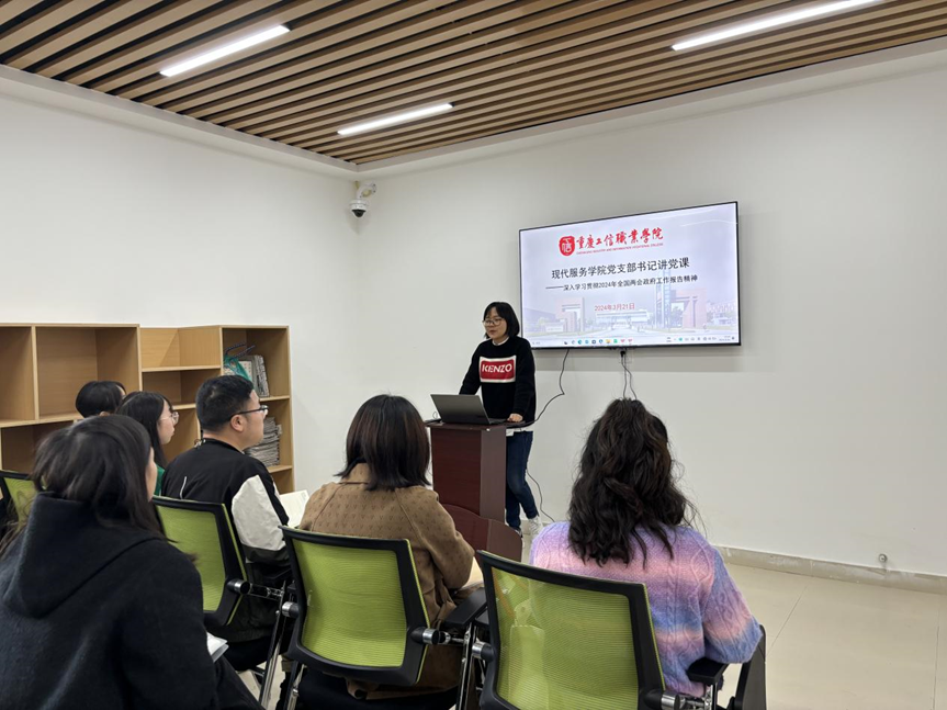 为深入学习领会2024年全国两会精神,进一步提升党员的政治理论素养,3月21日中午,现代服务学院党支部书记肖建敏同志以“深入学习贯彻2024年全国两会精神”为主题,为全体党员教师和学院学生代表上了一堂翔实生动的党课。