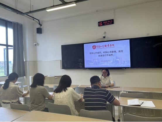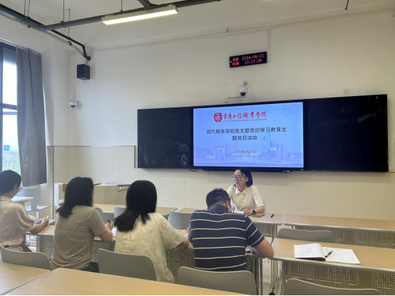 为深入学习贯彻修订后《中国共产党纪律处分条例》(以下简称《条例》),贯彻落实党中央《关于在全党开展党纪学习教育的通知》要求,进一步提升廉洁自律意识,筑牢拒腐防变的思想道德防线,引导全体党员学纪、知纪、明纪、守纪,2024年6月21日现代服务学院党支部书记肖建敏同志主持,带领全体党员开展“守纪律之严,铸党性之魂”主题党日活动。