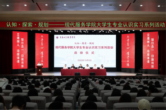 10月9日上午,系列活动在渝中校区大礼堂隆重拉开帷幕,一场连接知识与实践、校园与职场的成长之旅正式启程。启动仪式上,现代服务学院副院长肖建敏发表动员讲话。她强调,认识实习是同学们突破课堂边界、触摸行业实景的重要纽带,更是职业素养培育与职业方向探索的关键环节,希望同学们以“空杯心态”虚心汲取行业经验,以“问题意识”深入思考职业需求,以“敬畏之心”认真对待实践任务,为未来职场发展打下坚实基础。讲话结束后,现代服务学院党总支书记周艳宣布认识实习系列活动正式启动,现场响起热烈的掌声,标志着本次实践育人活动全面铺开。