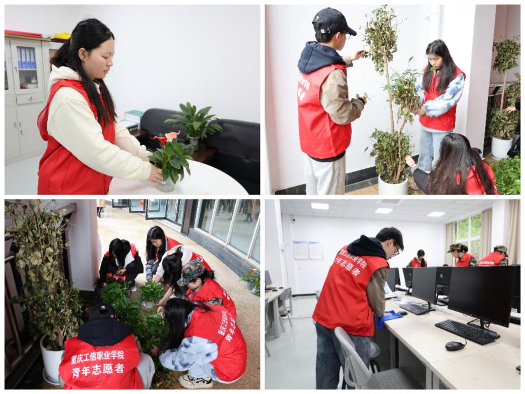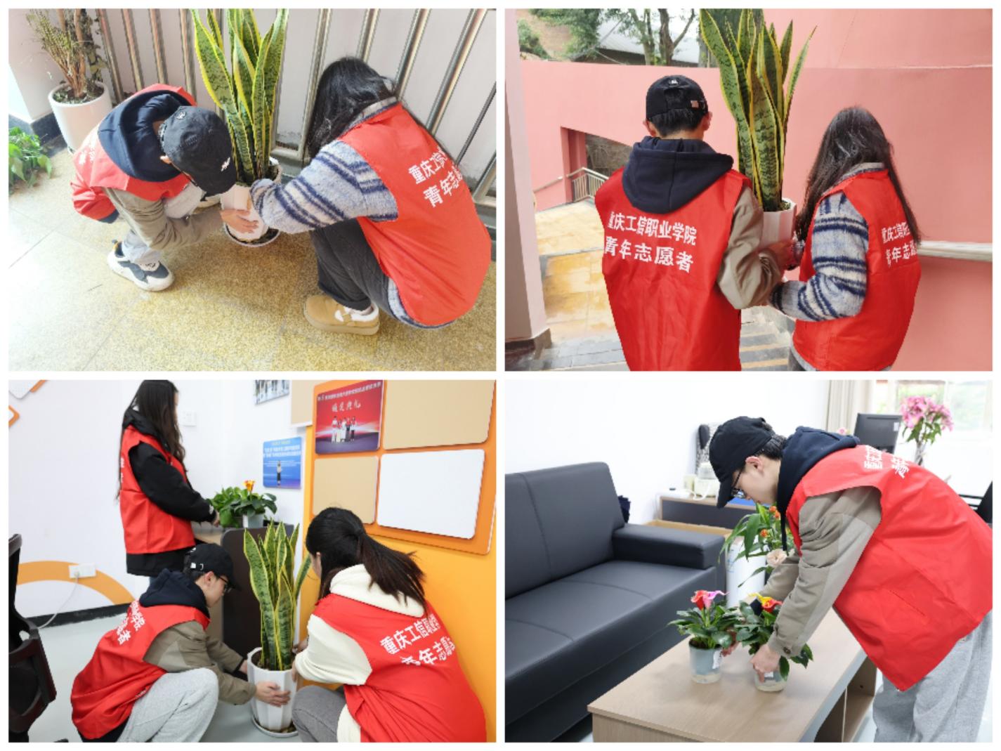 精心筹备,聚力笃行。活动筹备期间,现代服务学院团总支及学生会提前统筹规划、精细分工,科学划分工作区域,明确各志愿小分队的任务与职责,对工作流程、覆盖范围、细节标准逐一落实,为活动高效有序开展筑牢基础。活动中,各志愿小分队迅速奔赴指定责任区,以饱满的热情投入服务,从办公区域到实训大楼公共空间,志愿者们分工协作、默契配合,认真擦拭桌面浮尘、悉心整理物品、仔细清扫地面垃圾、彻底清理卫生死角,不放过一处细节、不遗漏一个角落;他们还走进校园绿化带,手持工具清理落叶、枯枝与杂草,细心为绿植浇灌补水、精心修剪枝叶、疏松土壤,让校园草木焕发生机。汗水浸润衣衫,却不减服务热情,志愿者们还将盆栽植物整理打包,用一抹绿意为老师们传递温暖敬意。