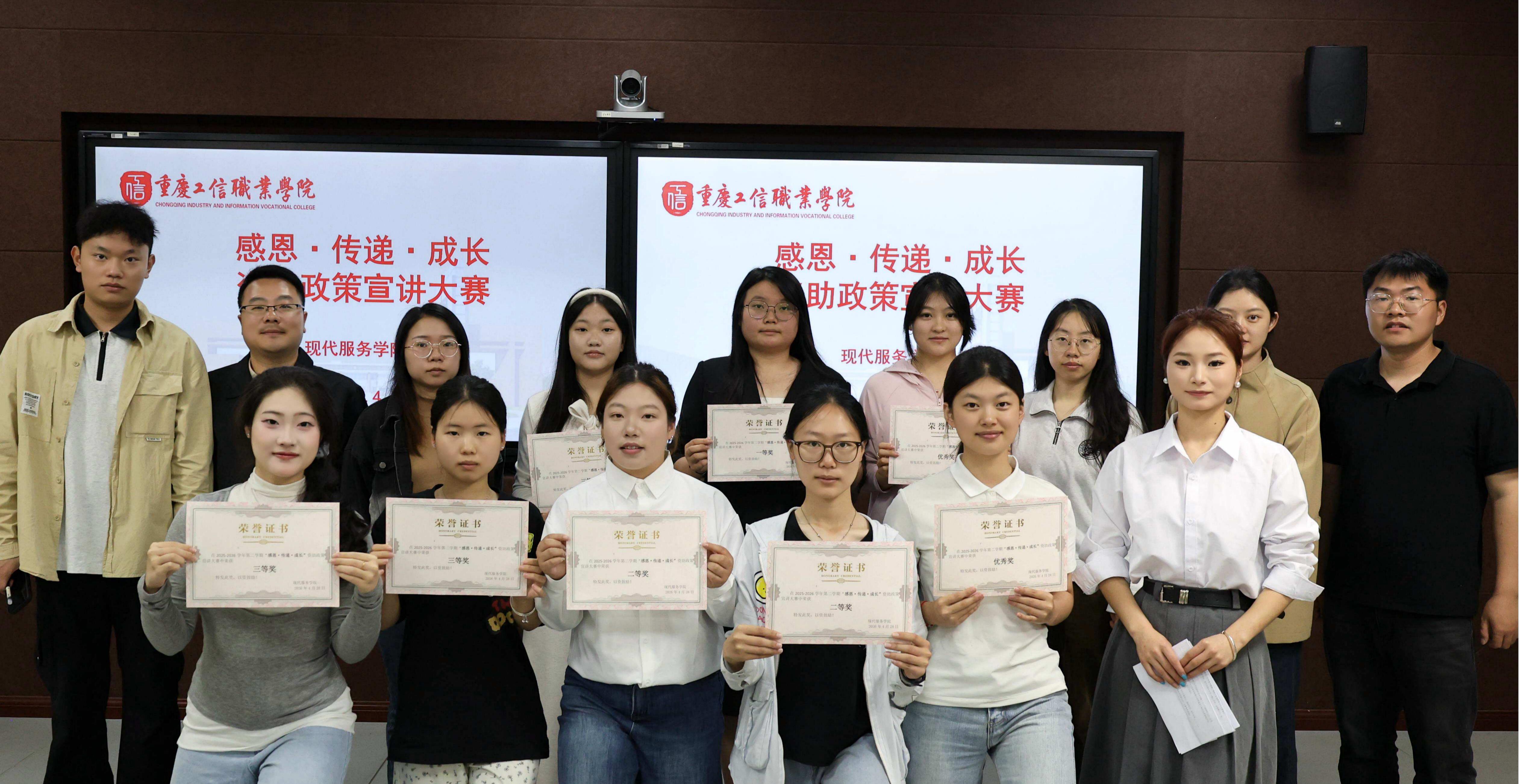 为深入贯彻国家及重庆市学生资助政策,全面落实学校立德树人根本任务,着力打造学院特色资助育人品牌,现代服务学院于4月28日上午在世纪楼未来教室成功举办2026年“感恩·传递·成长”资助政策宣讲大赛。本次活动旨在通过“以赛促学、以讲促宣”的模式,遴选与培育一支“知政策、懂感恩、善表达”的学生宣传骨干队伍,构建院、校两级联动的资助宣传与育人体系,全面提升资助政策的传播效力与育人实效。