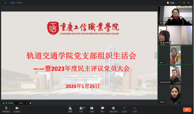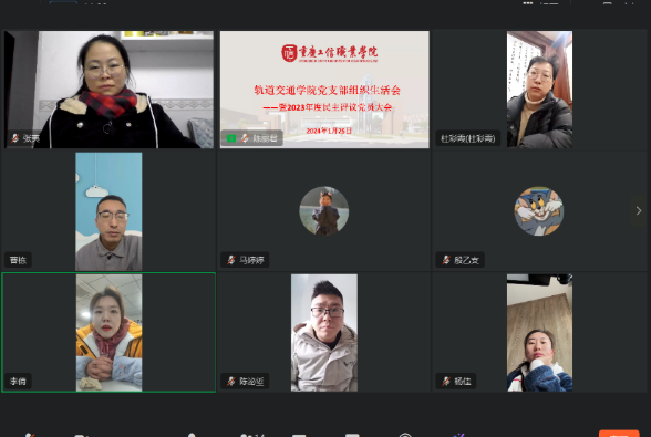 民主评议党员制度是加强党的建设的重要制度。根据校党委关于《召开2023年度基层党组织组织生活会和开展民主评议党员的通知》的要求。轨道交通学院党支部2023年度民主评议工作及组织生活会于2024年01月25日下午3:00以线上的方式召开,支部书记杜彩霞主持会议。支部现有党员15名,全部参加了民主评议。