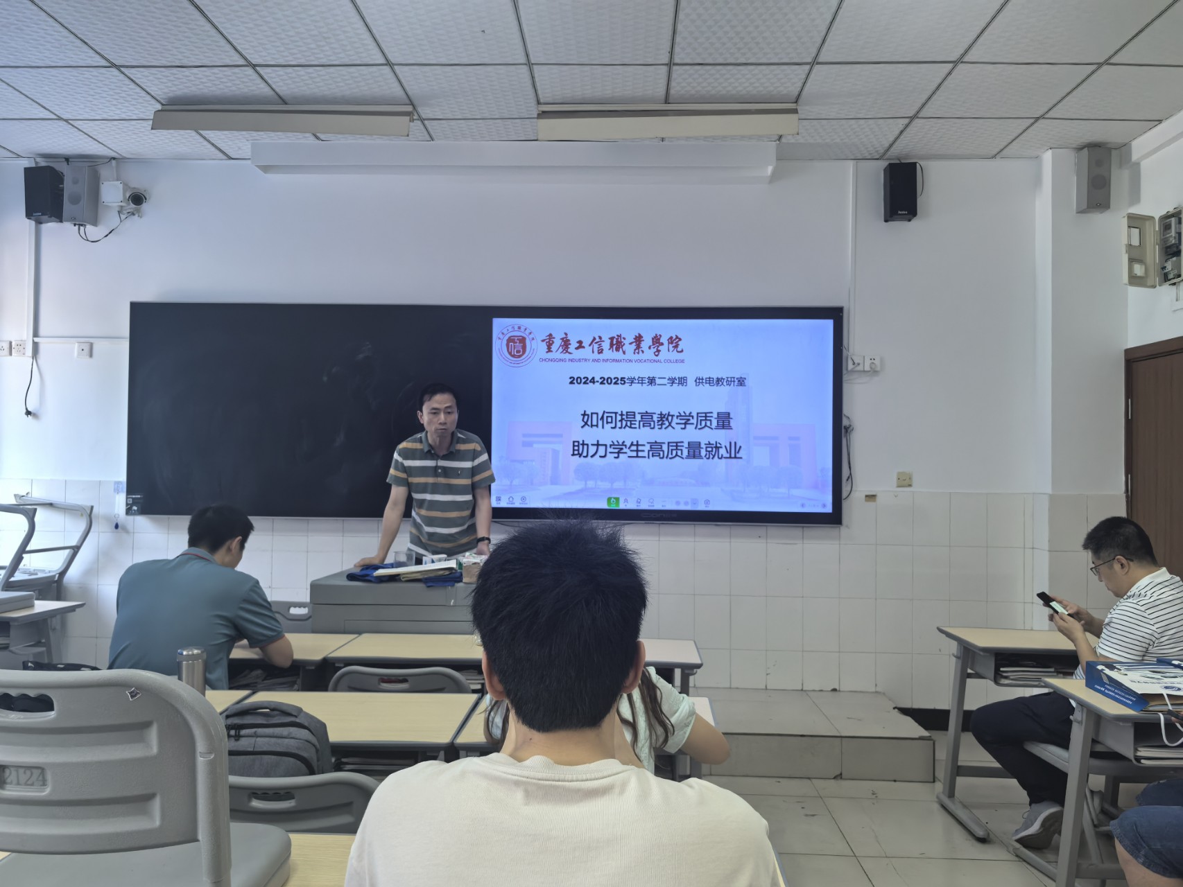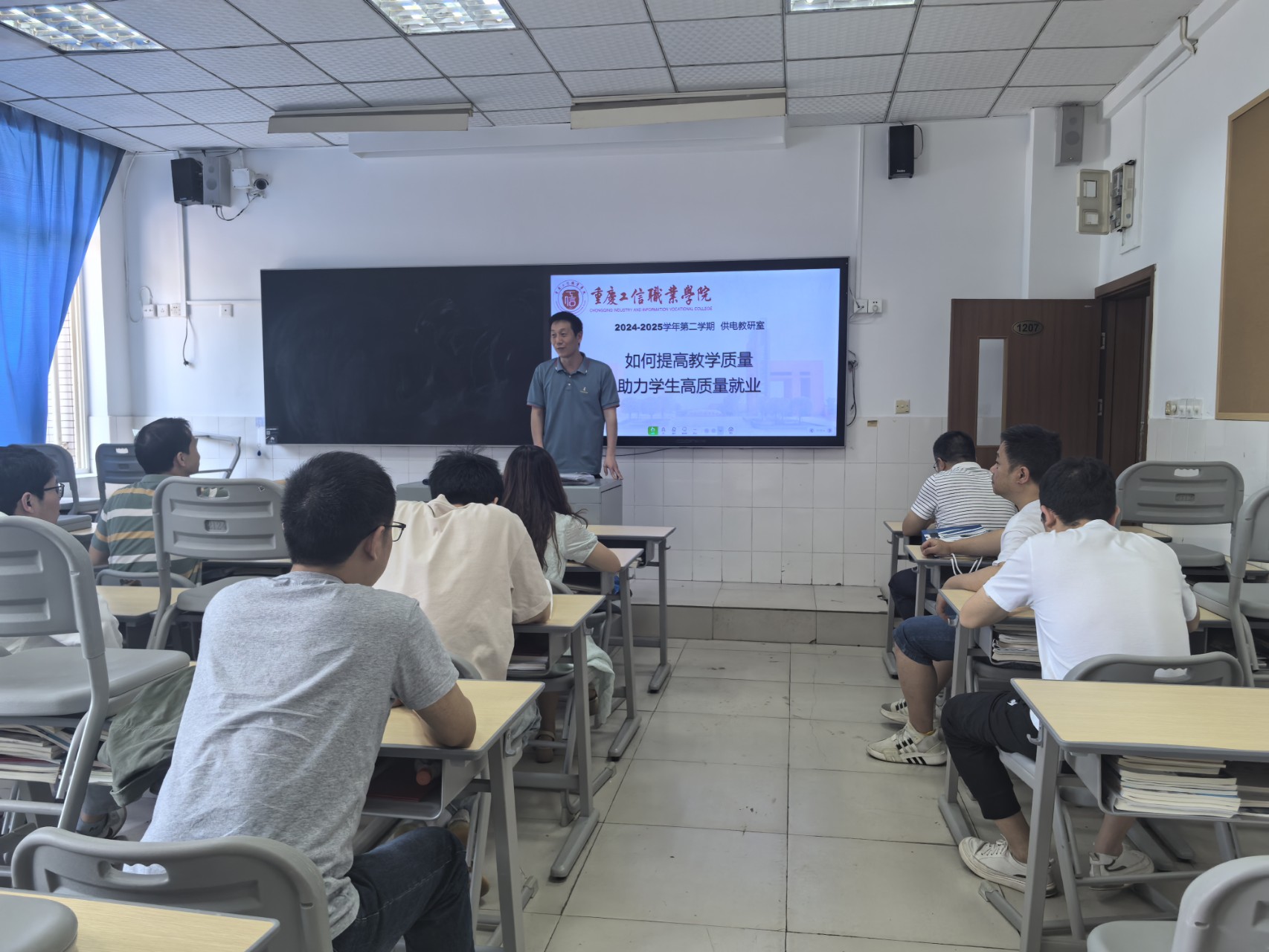 2025年4月18日,为落实《中共中央 国务院关于实施就业优先战略促进高质量充分就业的意见》和《中共中央办公厅 国务院办公厅关于加快构建普通高等学校毕业生高质量就业服务体系的意见》的文件精神,轨道交通学院供电教研室围绕"如何提高教学水平,助力学生高质量就业"主题召开专项教研会议,参加会议的有教研室全体成员,学院中职教学部主任石磊,综合办公室主任王震东。会议针对当前学生培养中的现实挑战展开教研室层面的探讨,重点就当前学生就业过程中存在的问题进行深入分析,并提出了跨校区实训资源共享、教学水平提升及就业竞争力培育等培养途径设想。