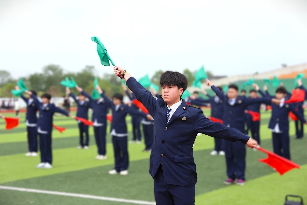 信号旗表演队高举红黄交织的旗帜闪亮登场!随着激昂的音乐,队员们如灵动的音符快速变换旗语动作,旗帜翻飞间划出绚丽弧线,精准的挥舞仿佛在传递无声的信号,将专业特色与青春活力完美融合,将开幕式气氛推向高潮。