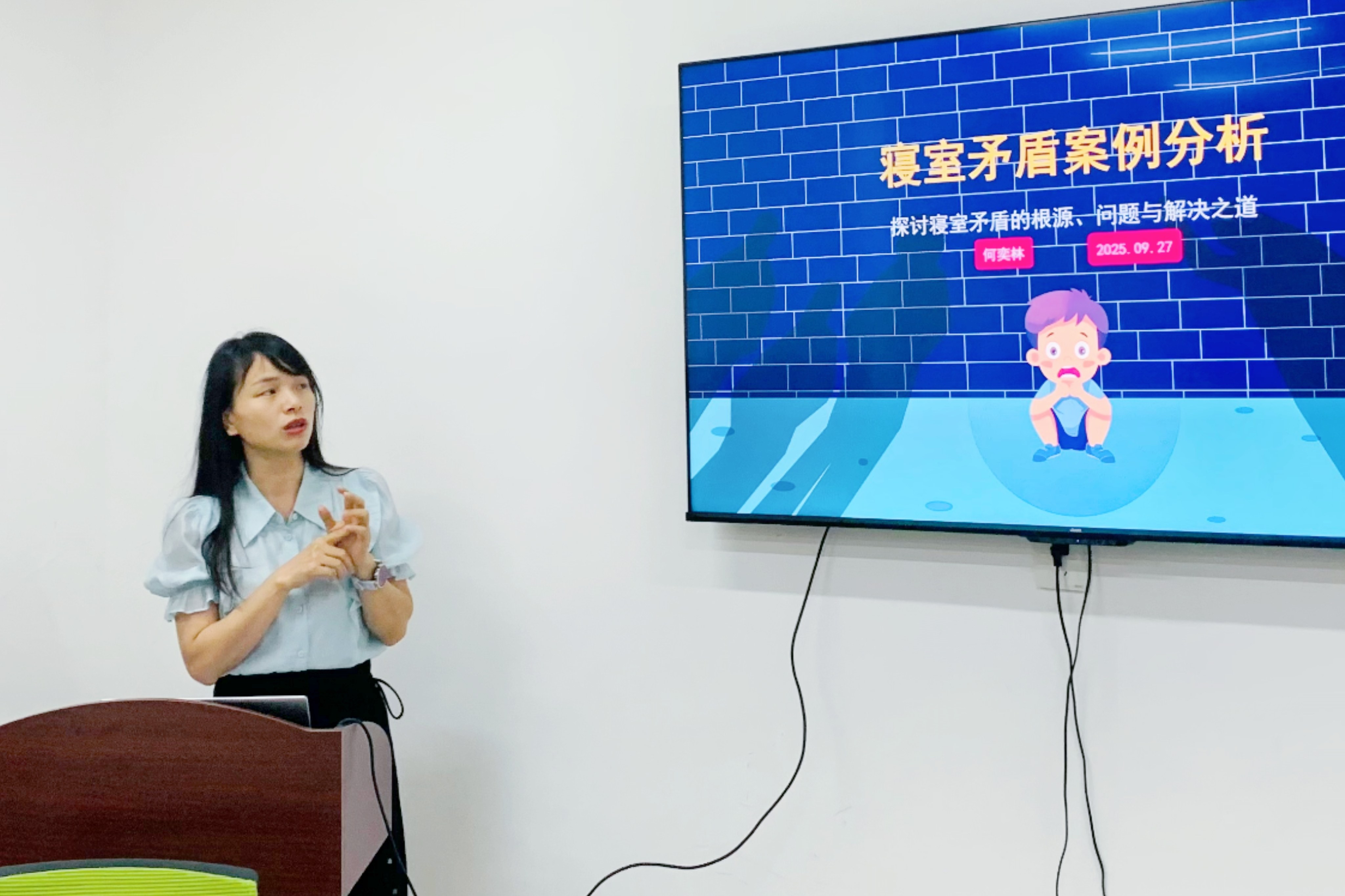 活动中,何奕林老师以典型寝室矛盾案例为切入点,从个人、家庭、学校三维度剖析根源:个人层面存在自我认知偏差、责任意识薄弱及沟通与自理能力不足的问题;家庭层面存在教育观念冲突、过度包办或溺爱的现象;学校层面则有制度落实不细、家校沟通不畅的情况。她同时提到,寝室矛盾化解意义重大,不仅关乎学生心理健康(长期紧张易引发焦虑)、影响学习与集体凝聚力(分散注意力、破坏互助氛围),更是“立德树人”的重要实践,能引导学生学会尊重、沟通与担当。