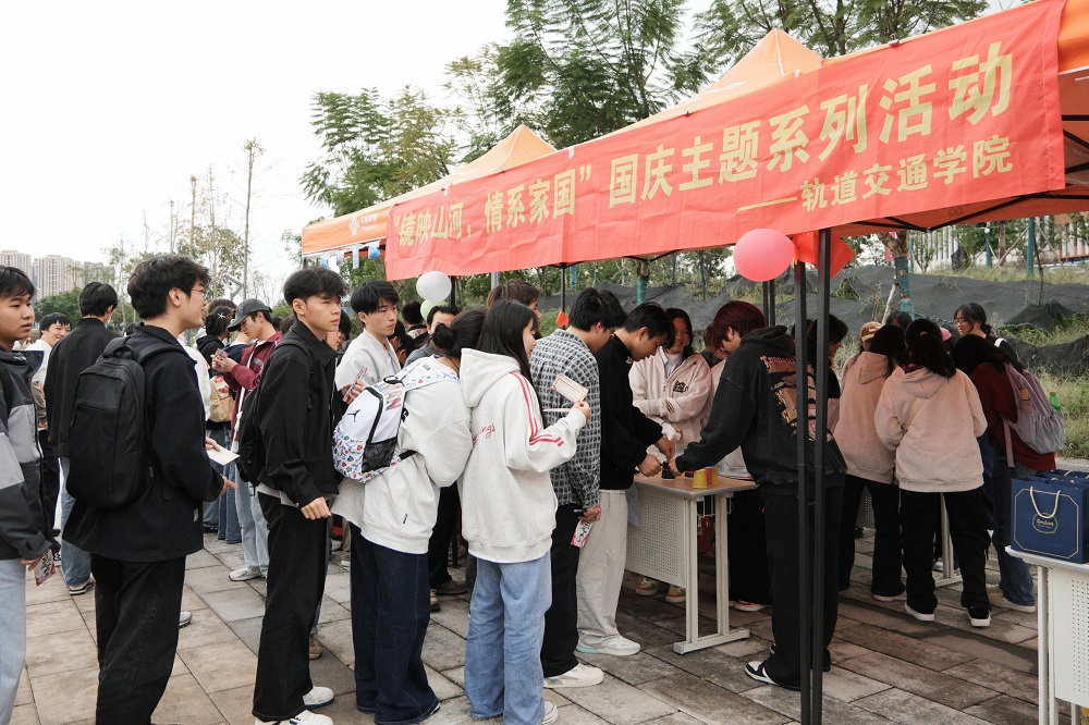 2025年10月21日,由轨道交通学院学生会主办的“镜映山河·情系家国”国庆主题系列活动在广知楼前小广场落下帷幕。自9月下旬启动以来,活动历时25天,通过线上主题摄影竞赛与线下沉浸式互动体验两大板块,实现了思想引领、文化浸润与青年参与的有机融合,为全院学子呈现了一场兼具艺术美感、精神深度与实践温度的爱国主义教育盛宴。