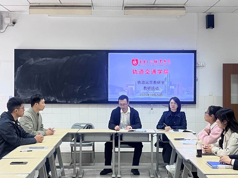 2025年10月24日中午,轨道交通学院铁道运营教研室在渝中校区1208教室组织开展第七周教研活动。活动由教研室主任赵文臣主持,教研室全体教师参会,轨道交通学院院长黄兰华莅临指导,围绕教学管理优化、课程建设深化、人才培养质量提升等核心议题展开深入研讨。