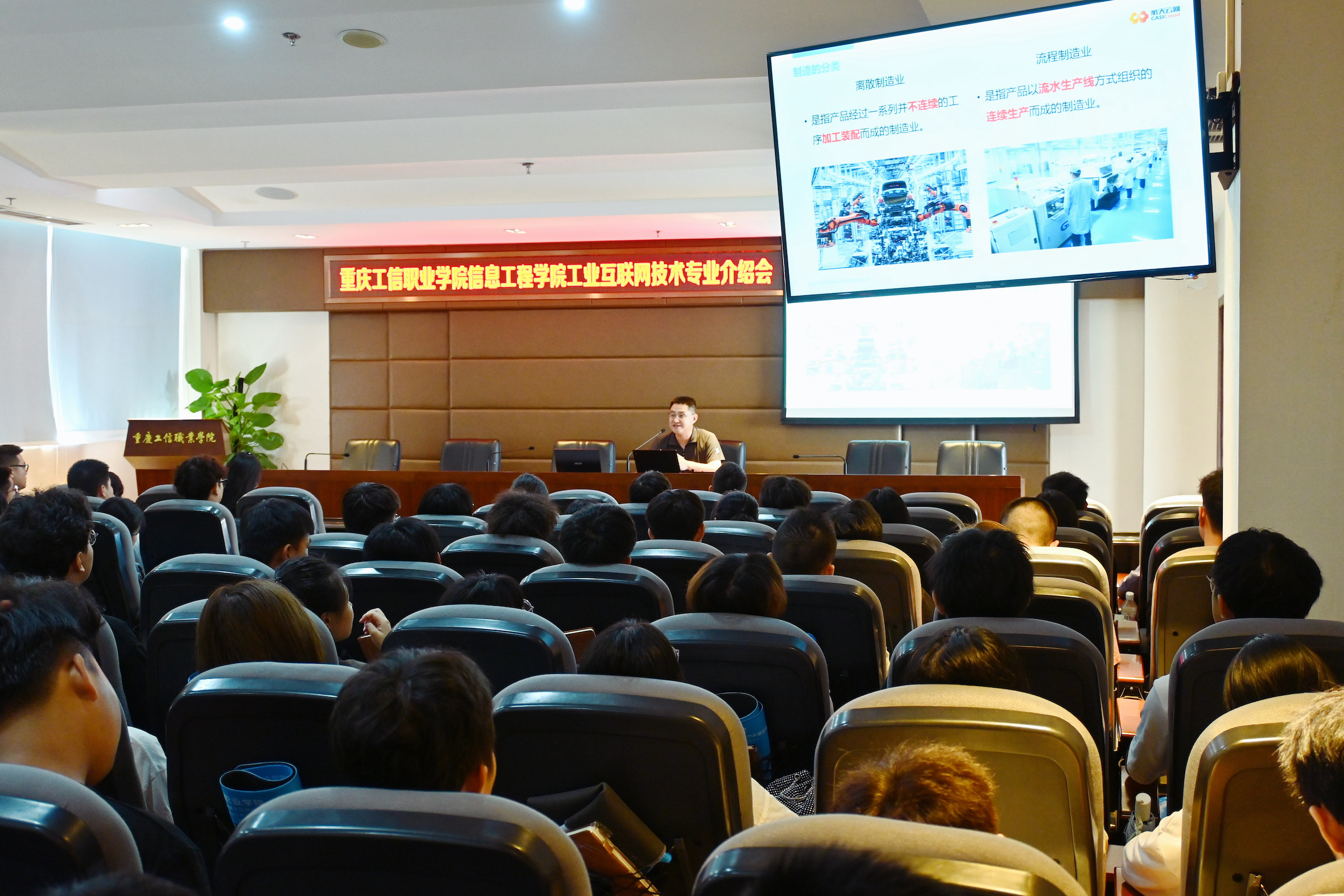 随后,航天云网重庆公司资深专家、重庆工业大数据创新中心行业总监高绪龙,凭借多年DICT行业深耕经验,为新生带来专业启蒙讲解。他以“工业革命演进”为切入点,从手工生产到机械化、电气化、自动化,再到如今的智能化,清晰梳理产业发展脉络,并提炼工业互联网核心价值:“关键在于‘连接人机物’、打通数据壁垒,依托平台支撑大规模个性化定制、远程运维等新型生产模式,成为制造业提质增效的核心引擎。”同时,他结合航天云网实践案例——如重庆工业和信息化产业云图的数字化呈现、新兴通用数字孪生工厂的5G+VR应用,让新生直观看到专业技术在产业中的落地场景;最后提及行业人才缺口现状,鼓励新生扎实掌握工业互联网技术核心能力,为未来职业发展筑牢基础。