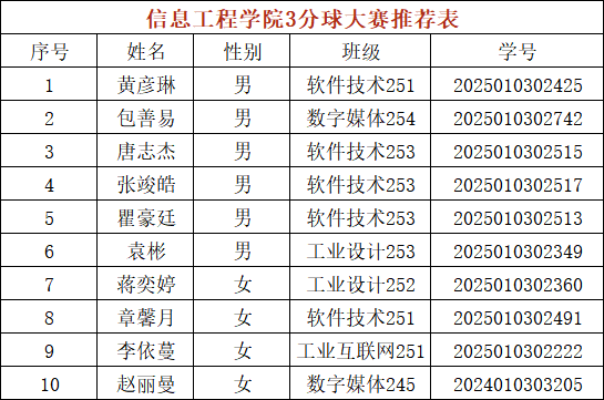 经过公平角逐与综合评定,本次比赛顺利完成校级赛事选拔工作。最终选出3 支男子队伍、2 支女子队伍,将代表我院参加校级 3v3 篮球争霸赛;同时选拔出6 名男生、4 名女生,将参与校级 3 分球大赛的比拼。学院对入选队伍与选手表示祝贺,希望他们在校级舞台上再接再厉、赛出水平、为院争光。
