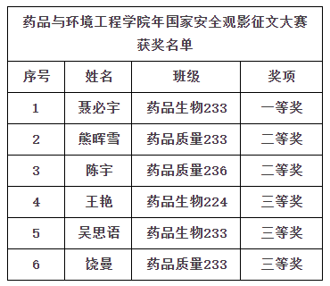 为了引导学生关注国家安全问题,强化学生国家安全意识,提高学生的写作能力,思辨能力以及国家安全素养。药品与环境工程学院组织学生观看了国家安全主题影片《万里归途》,并撰写国家安全主题征文,引导学生主动运用所学知识分析国家安全问题。根据比赛作品征集通知,征集工作受到了学院学生的积极响应,共收到应征作品17篇。遵循公开、公平、公正的原则,经过参赛作品收集、评审,现将获奖名单进行公示如下: