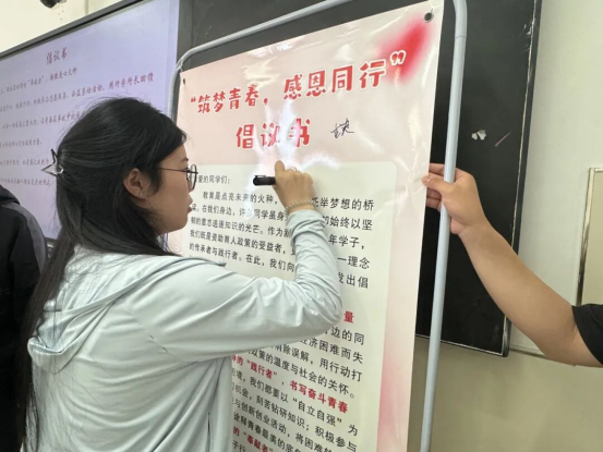 随后,受助榜样同学——周营玲、周圣翔和陈苗,分别分享了自己的励志故事并带领在场同学签署了倡议书。他们虽然来自不同的家庭背景,但都有着共同的特点:自立自强、努力奋斗。他们的故事也激励着在场同学化感恩为行动。