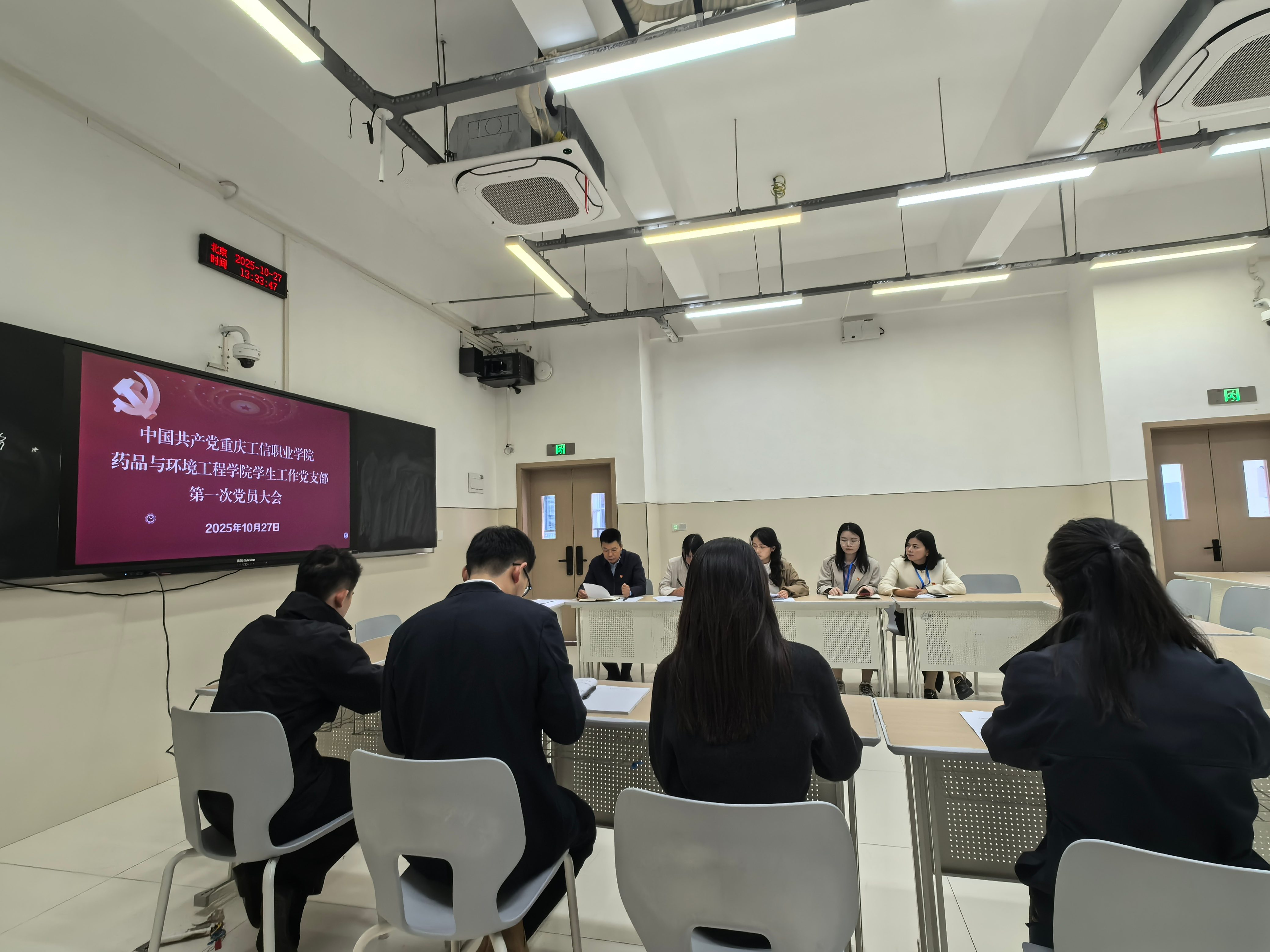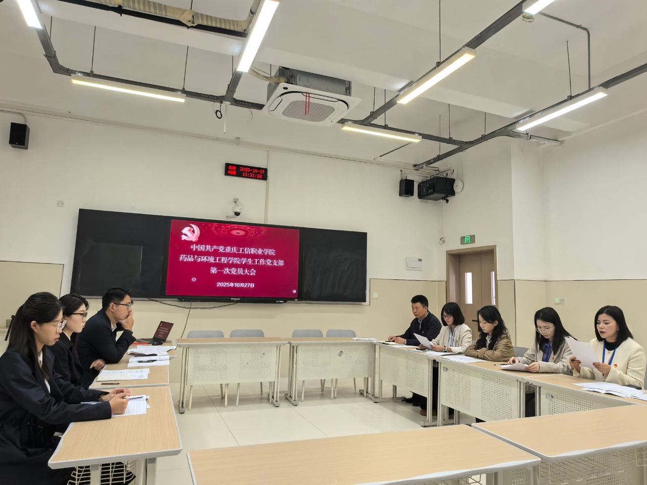 2025年10月27日,中共重庆工信职业学院药品与环境工程学院学生工作党支部第一次党员大会在重庆工信职业学院(长寿校区)2309会议室隆重举行,大会在庄严的国歌声中开幕。药品与环境工程学院党总支书记欧永春和学生工作党支部全体党员一起参加大会。