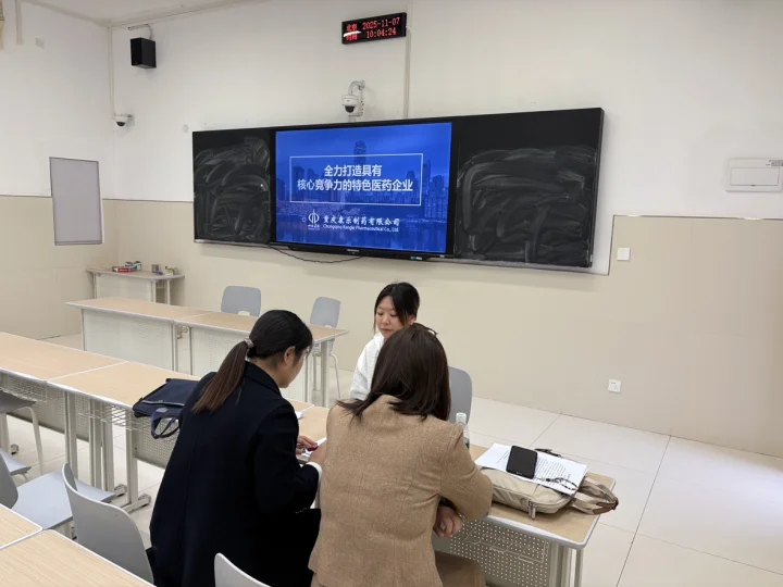 重庆康乐制药人力资源总监代表企业进行宣讲,全面介绍了公司的发展历程、核心业务、研发实力及未来战略。作为重庆市重点制药企业,康乐制药专注于慢性病用药、中药现代化及创新制剂的研发与生产,产品覆盖全国并逐步走向国际。企业强调“以科技守护健康,以责任回馈社会”的使命,赢得了在场师生的高度认同。
