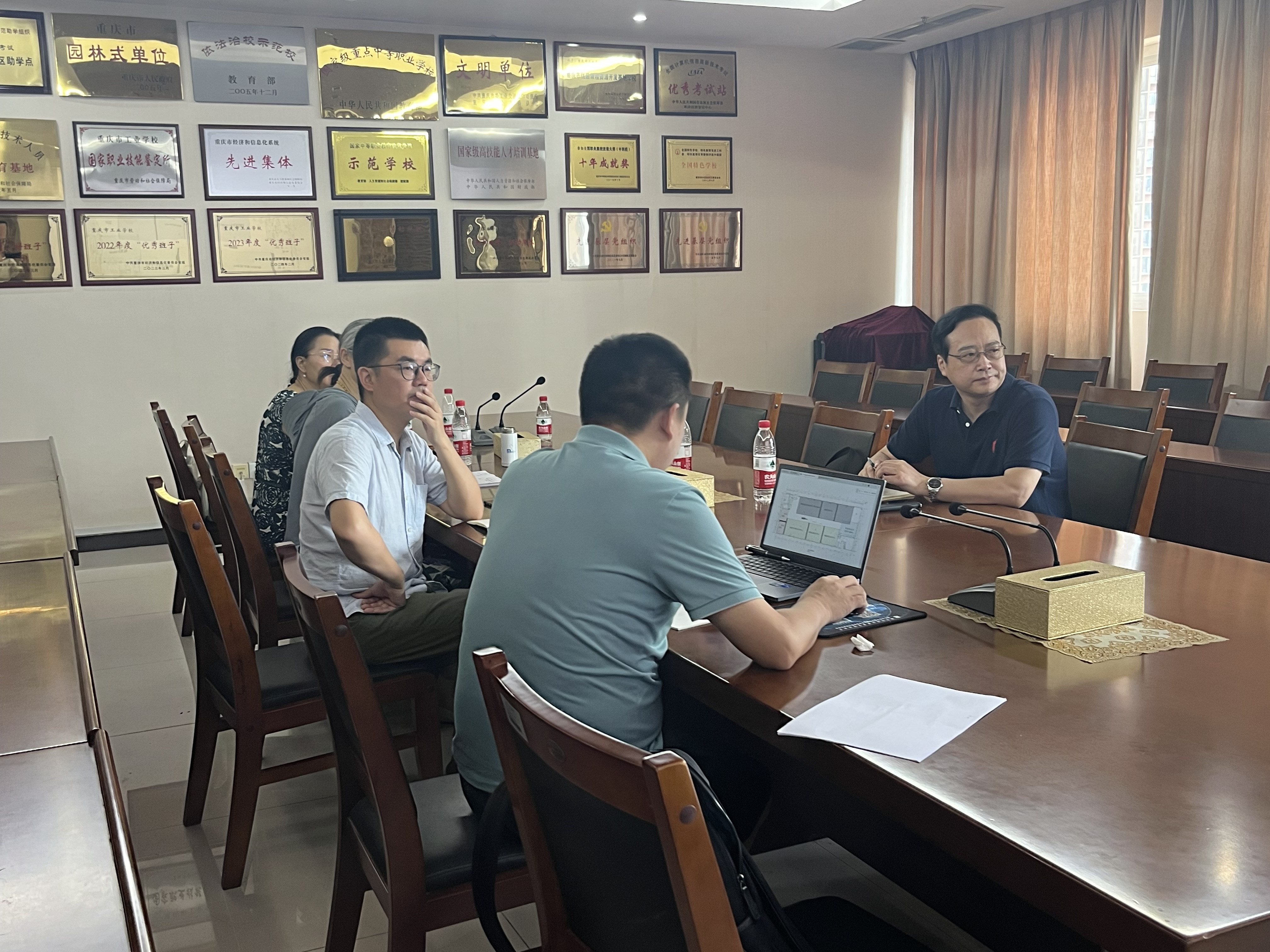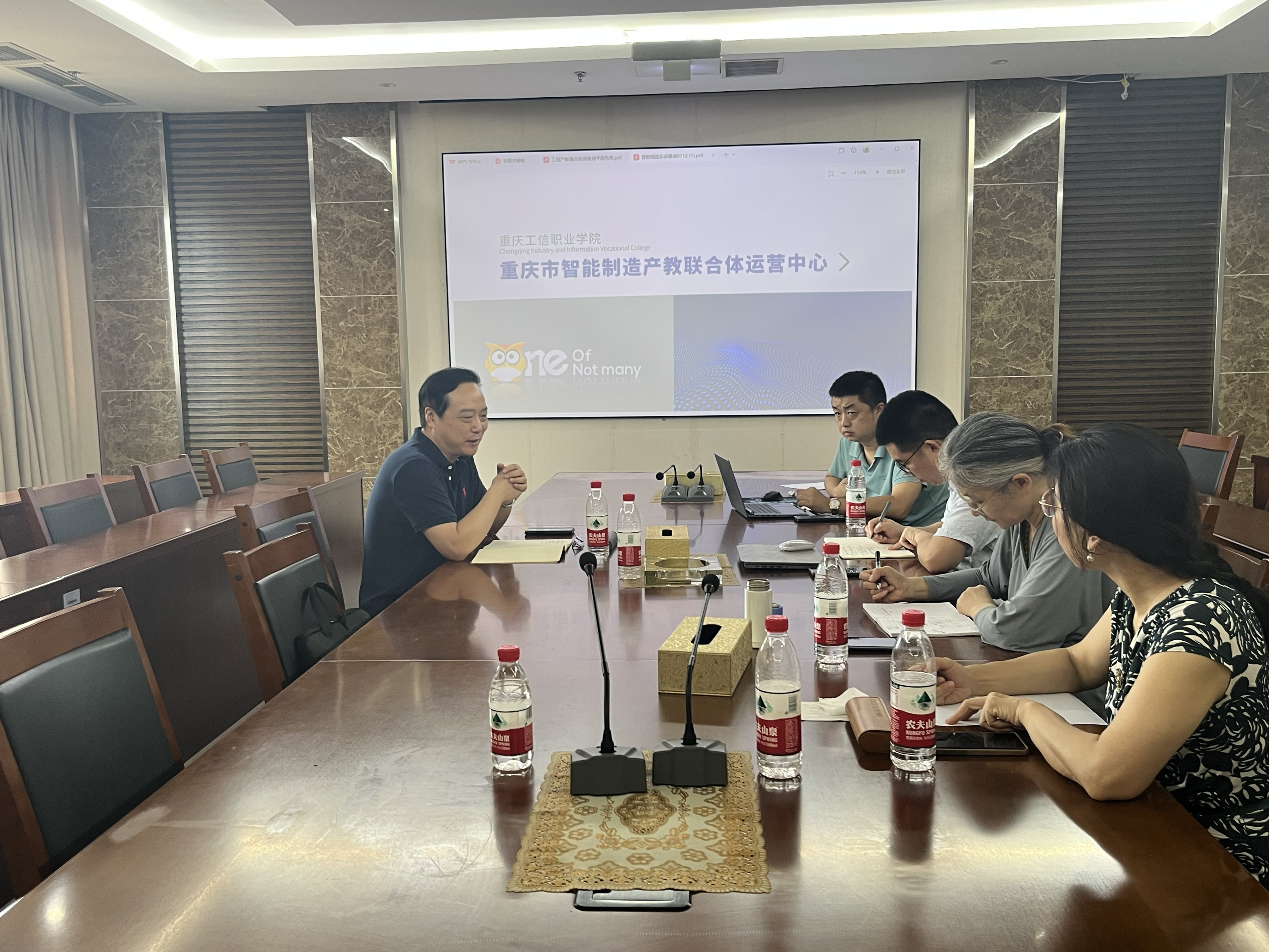 7月19日,重庆市智能制造产教联合体建设研讨会在重庆工信职业学院渝中校区召开。本次会议由工信职业学院副院长柴彬堂、教务处负责人万美春、科研处负责人黄玉兰、智能制造学院负责人杨乐、科研处张雁博士、周晓龙老师参加,会议就共同就联合体的发展规划、场地布局、建设思路等核心议题进行了深入研讨。