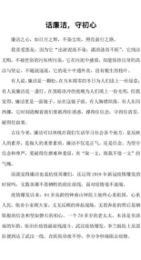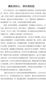 廉洁是一个干净的词,也是一种美德、一种品质、一种精神。恰是一江春水荡漾一切污秽,廉洁是一段刚的乐,奏响和谐校园美丽篇章。清正廉洁,是我们人生旅途中美丽花草的种子,清正廉洁是一股清泉,滋润着我们的心。同时,廉洁之心还能让我们更加珍惜和感恩生活中的每一个瞬间和每一次经历。拥有清正廉洁,我们的世界会无限大,生活会无限好!