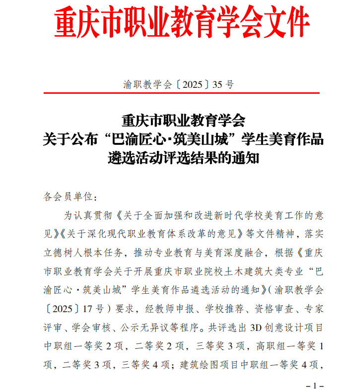 “巴渝匠心・筑美山城”学生美育作品遴选活动旨在促进职业院校土木建筑大类专业学生专业技能与美育素养的融合,激励学生创作展现巴渝地域文化特色和山城建筑之美的作品。我院将以此获奖为契机,持续推进专业与美育的融合教育,培育更多兼具匠心与创意的高素质技术技能人才。
