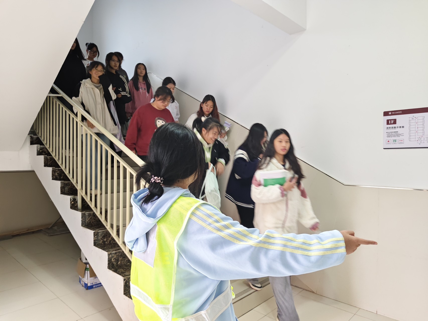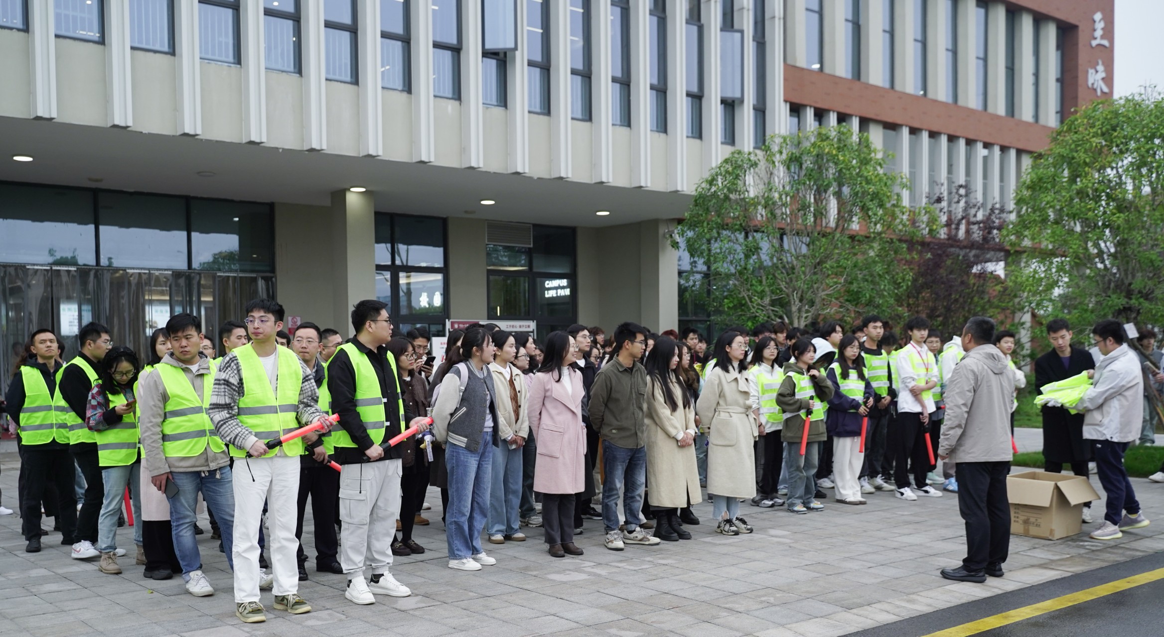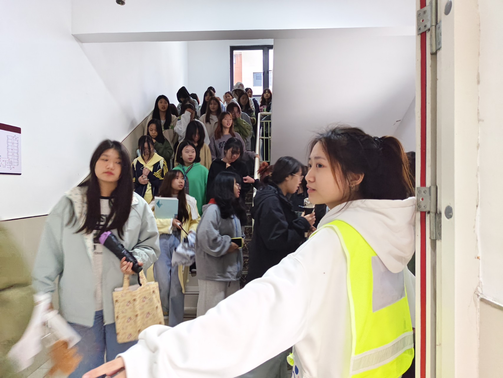 演练活动由学校安全应急领导小组精心策划,参与对象包括2023级、2024级全体学生,全体辅导员、一站式学生社区楼园自治会以及相关部门工作人员。演练前,各班级辅导员组织了主题班会,对学生们进行了消防安全知识的普及,并详细讲解了疏散路线和集合地点。下午13时整,所有参演人员在至味堂前集结完毕后,按照预案提前到达指定点。随着警报声响起,演练正式开始。学生们在一站式学生社区楼园自治会同学和疏散指挥员的引导下,迅速而有序地沿着预先设定的安全路线疏散,最终顺利到达指定的安全区域。整个过程中,学生们表现出良好的纪律性和团队协作精神,没有发生任何拥挤或混乱现象。各楼栋完成人员的撤离时间分别为:清扬苑5分38秒、蕙兰苑7分53秒、秀慧苑6分25秒、思齐苑5分30秒、明志苑6分17秒。演练结束后,各学院负责人立即组织学生进行人员清点,确保每位师生都已安全抵达集合点。
