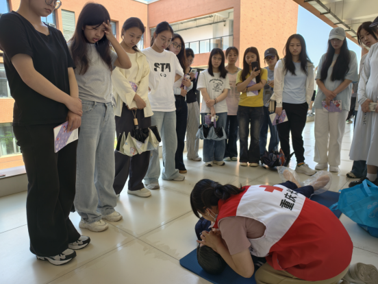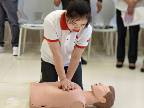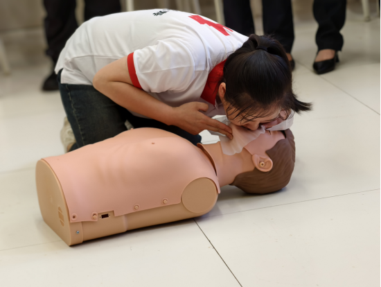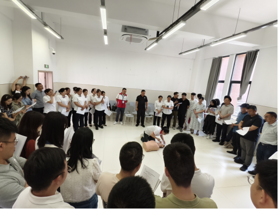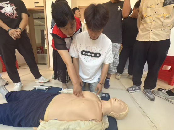 第一场培训通过普及应急救护知识,提升学生在面对突发状况时的应对能力。培训内容涵盖心肺复苏、人工呼吸、自动体外除颤器(AED)的使用方法等核心急救技能。在理论学习后,同学们分组进行实操训练,利用模拟人、AED模拟器等设备反复练习,讲师们则一对一进行指导和纠错,确保现场同学都能熟练掌握急救技能。