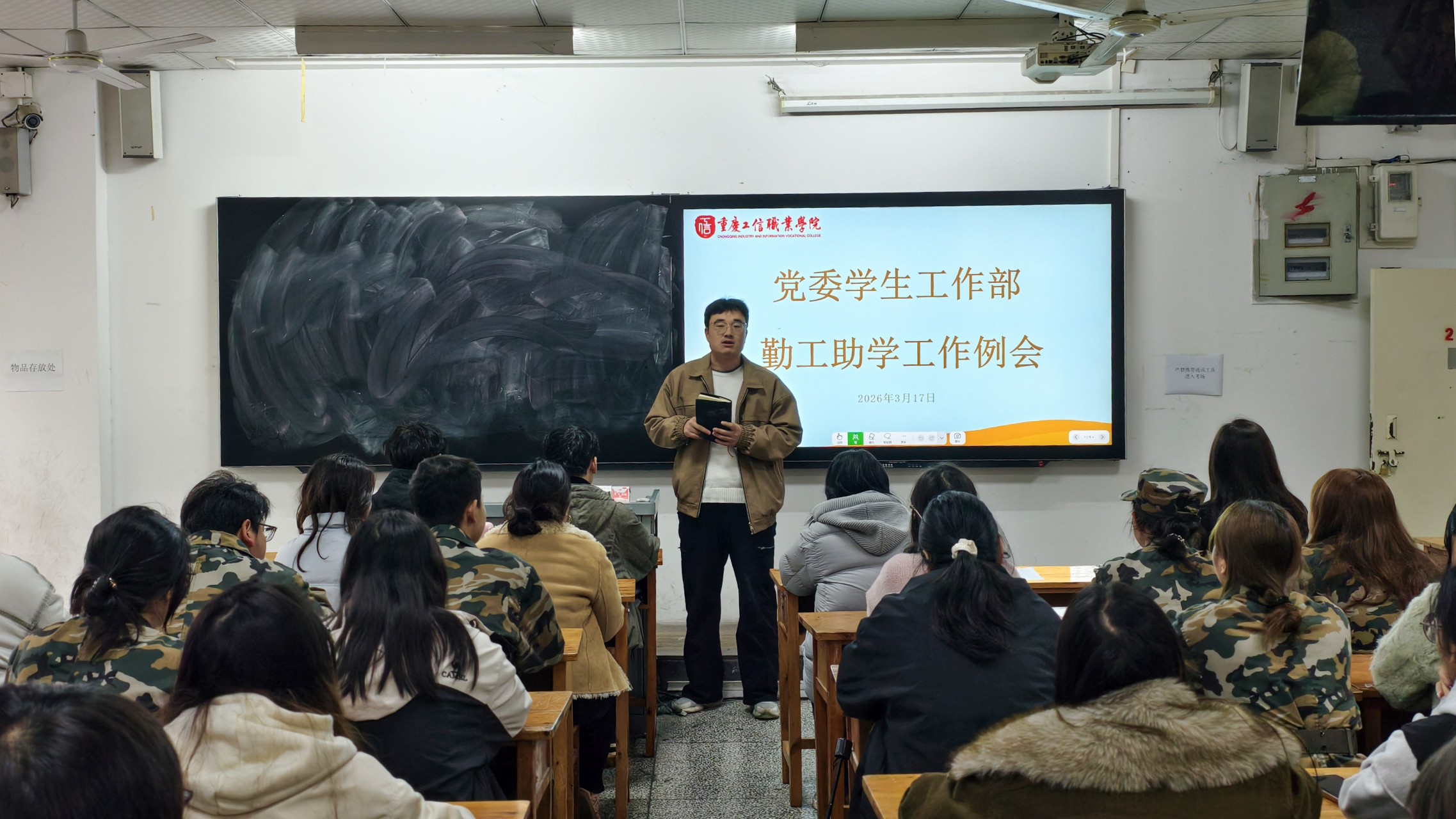 为进一步落实“一站式”学生社区育人要求,规范勤工助学岗位管理,帮助新聘任同学快速适应岗位角色,2026年3月17-18日晚,重庆工信职业学院芯青年“一站式”学生社区服务中心分别在长寿、渝中两校区同步举办新学期勤工助学岗位见面会,社区管理科老师与本学期新聘任的90名同学分校区参加了本次活动。