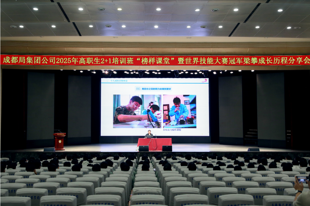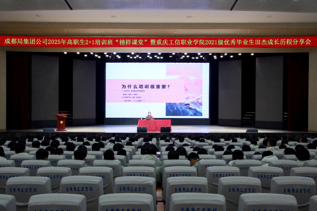 2025年4月2日18时30分,重庆工信职业学院大礼堂内掌声雷动,中国铁路成都局集团有限公司2025年高职生“2+1”定向培养理论培训班学员齐聚一堂,共同聆听第45届世界技能大赛金牌得主梁攀与重庆工信职业学院2021级优秀毕业生、成都局集团公司在职员工田杰的成长经历分享。200余名学员在两位榜样的故事中,感悟工匠精神,坚定职业信念。