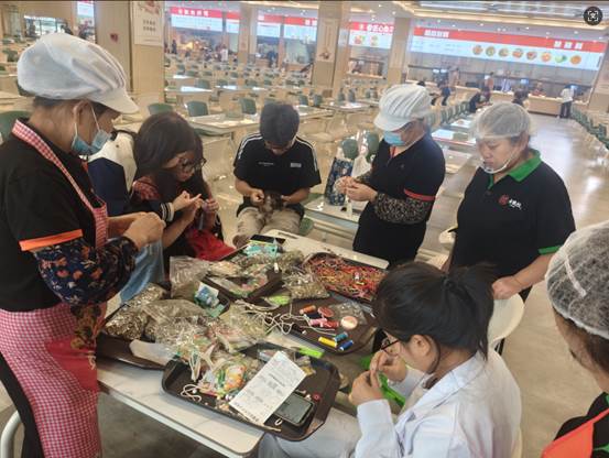 活动现场,宛如一个传统文化“小作坊”,热闹非凡。食堂工作人员提前做足准备,将包粽子的糯米、粽叶、红枣、红豆等材料一一摆好,整齐有序;制作香包的彩布、丝线、艾草等物料也分门别类、静静等待同学们的巧手赋予它们新的生命。