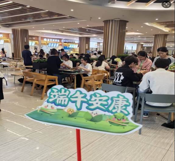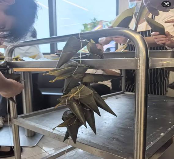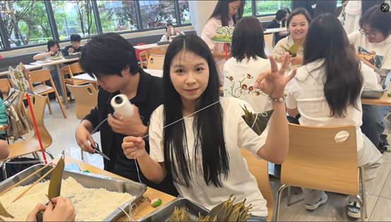食堂师傅们摇身一变,成为技艺高超的“手工导师”。他们一边熟练地包着粽子,一边耐心地为同学们讲解包粽子的技巧:“先把粽叶折成漏斗状,接着填入适量的糯米,再放上喜欢的馅料,然后用手指压实,最后用丝线捆扎牢固。”同学们围在一旁,眼睛紧紧盯着师傅们的双手,生怕错过任何一个细节。在师傅们的悉心指导下,同学们纷纷动手尝试。一开始,大家包出的粽子形状千奇百怪,有的像“小枕头”,有的“四不像”,有的不成形,但谁都没有气馁,反而越包越起劲。在一次次的尝试中,同学们逐渐掌握要领,包出的粽子也越来越有模有样。现场欢声笑语不断,充满节日欢乐氛围。