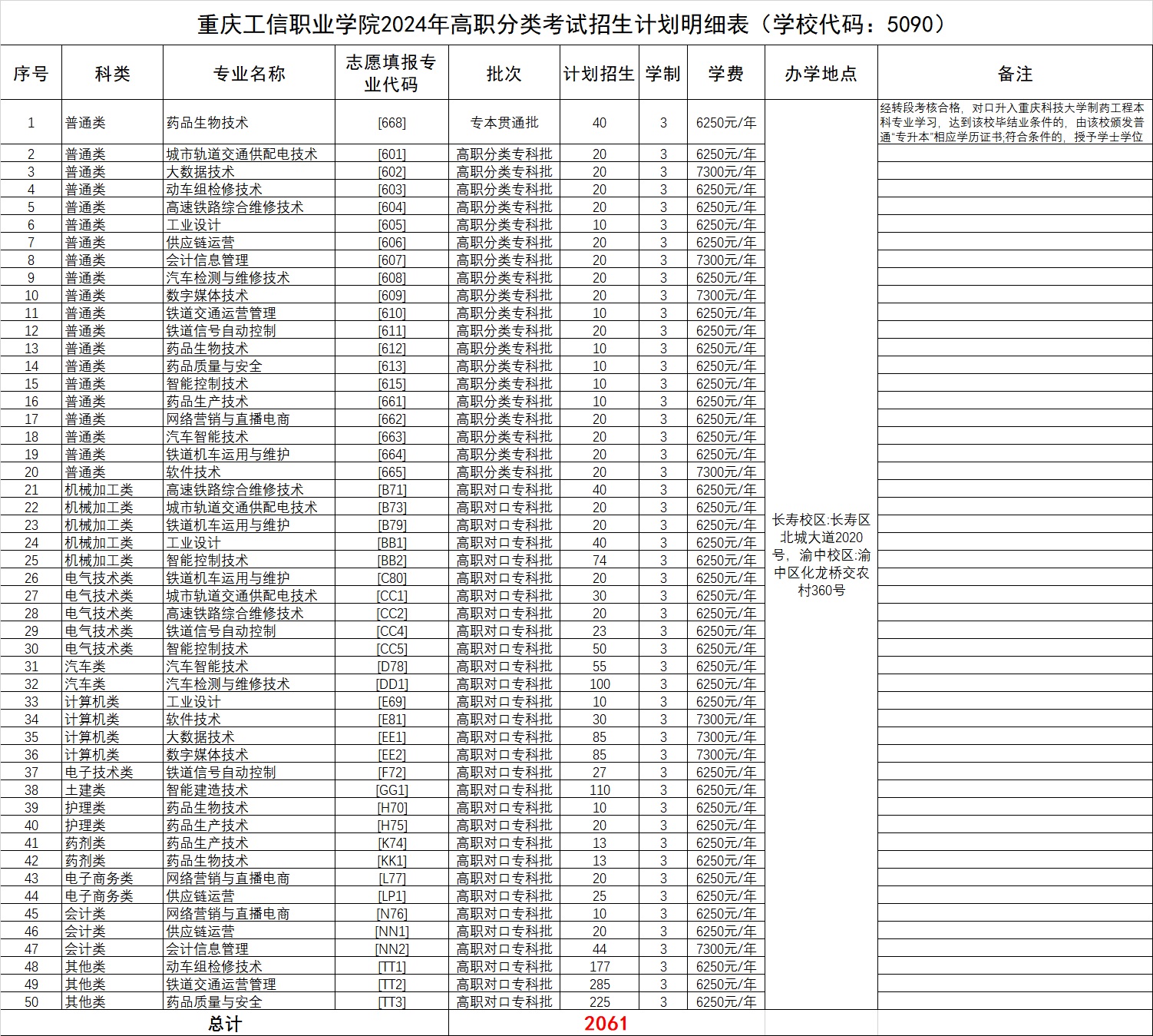 重庆工信职业学院2024年高职分类考试招生计划明细表