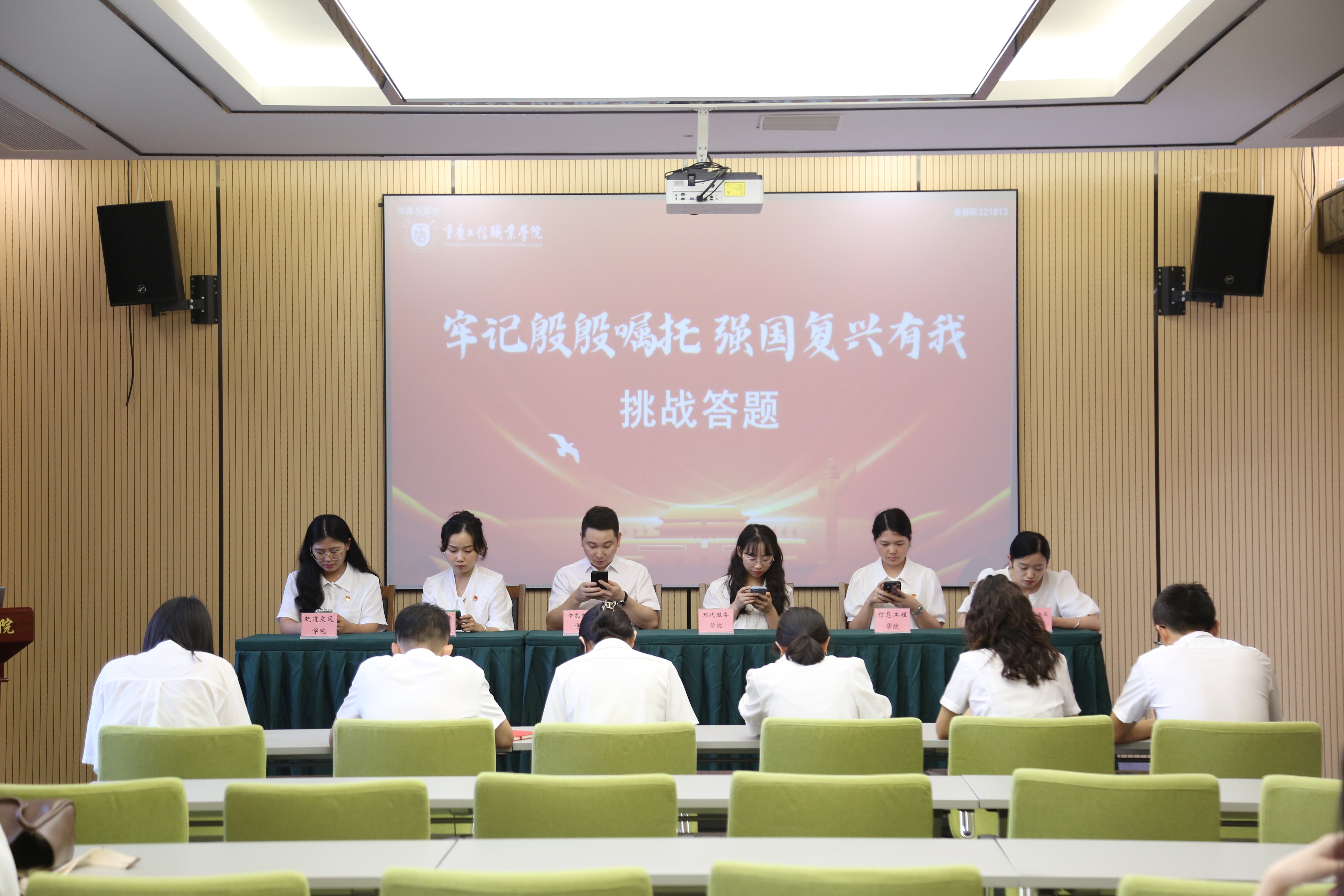 为深入学习贯彻习近平新时代中国特色社会主义思想和党的二十大精神,深刻领会习近平总书记视察重庆重要讲话重要指示精神,6月26日,我校开展了“牢记殷殷嘱托 强国复兴有我”主题知识竞赛暨微宣讲比赛,由各二级学院党支部精心组织、选拔而成的6支代表队参加了此次比赛。