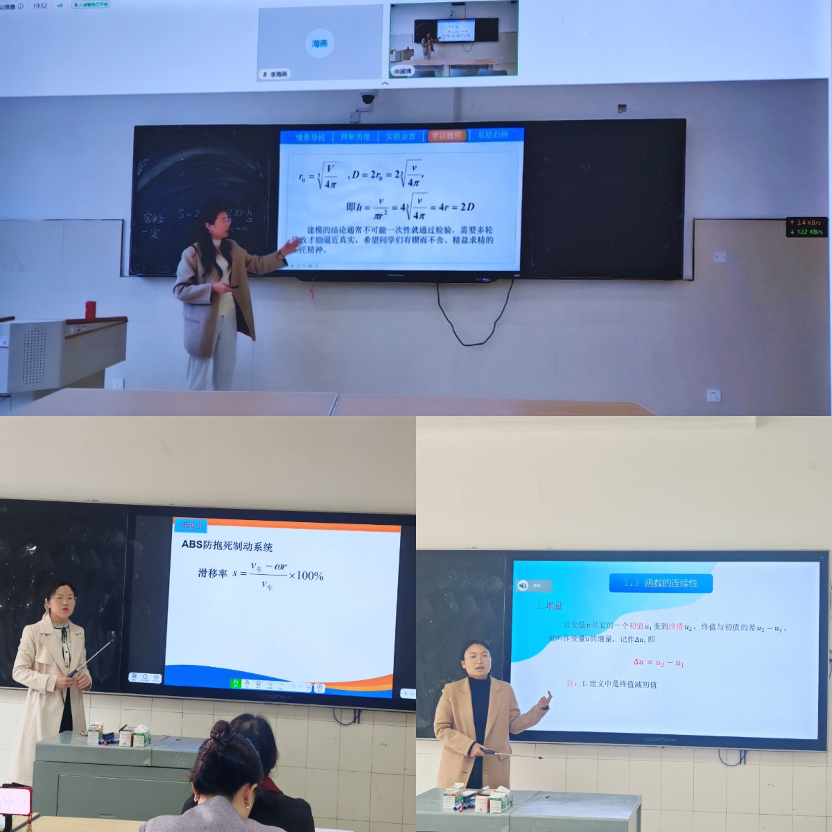 在备赛展示环节,三名参赛教师依次进行了 20 分钟无生授课,展现了各具特色的教学风格:万祖春老师讲授《函数最值的应用》,她以易拉罐表面积求解为切入点,全程融入数学建模思想,逐步推导解题过程,引导学生提炼建模步骤,有效培养了学生解决实际问题的数学应用能力。李海燕老师讲授《函数的连续性》,她利用茶叶、鞋的价格函数关系引入概念,由浅入深解析核心知识点;结合水银温度计与额温枪的使用场景,通俗易懂地讲解了连续与间断的关系,实现了生活化教学。张雪老师讲授《无穷小》,她借助汽车 ABS 系统中的滑移率引出概念,细致讲解内涵,搭配实例辅助理解,深入分析了极限与无穷小之间的逻辑关系,授课过程条理清晰、逻辑严密。