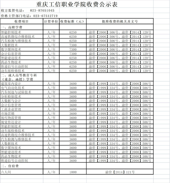 重庆工信职业学院收费公示表