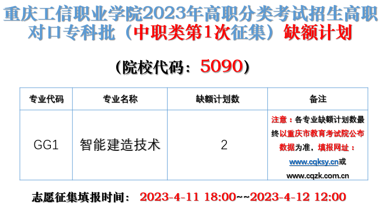 重庆工信职业学院2023年高职分类考试招生高职对口专科批(中职类第1次征集)缺额计划