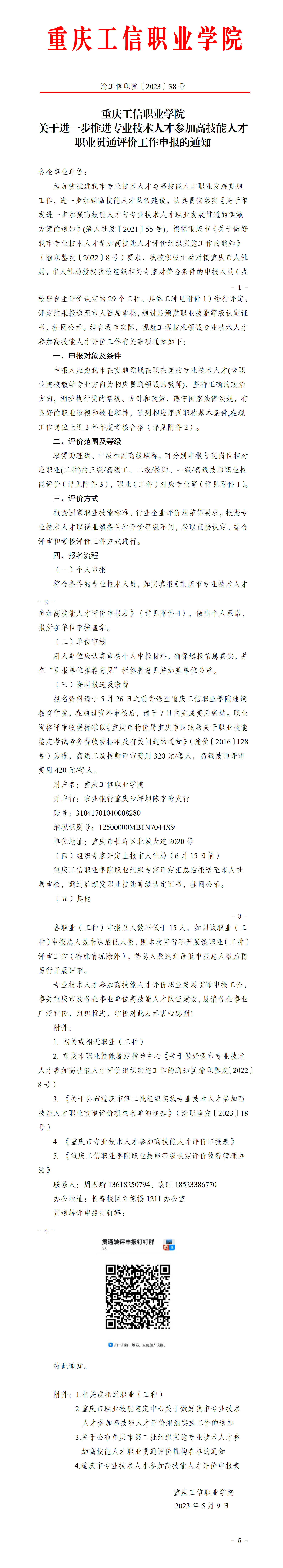附件1:相关或相近职业(工种).docx 附件2:市人社局:关于做好我市专业技术人才参加高技能人才评价组织实施工作的通知.pdf 附件3:关于公布重庆市第二批组织实施专业技术人才参加高技能人才职业贯通评价机构名单的通知(渝职鉴发〔2023〕18号).pdf 附件4:重庆市专业技术人才参加高技能人才评价申报表.doc