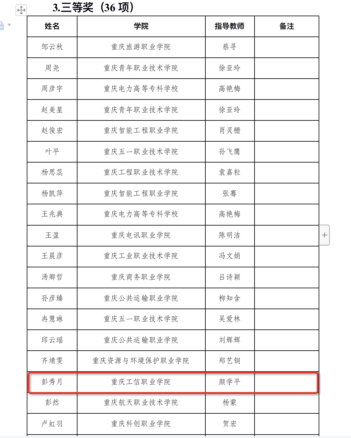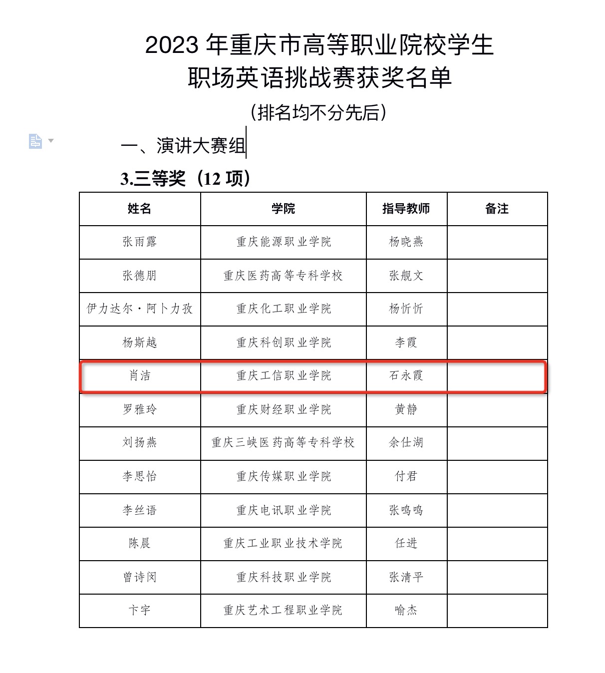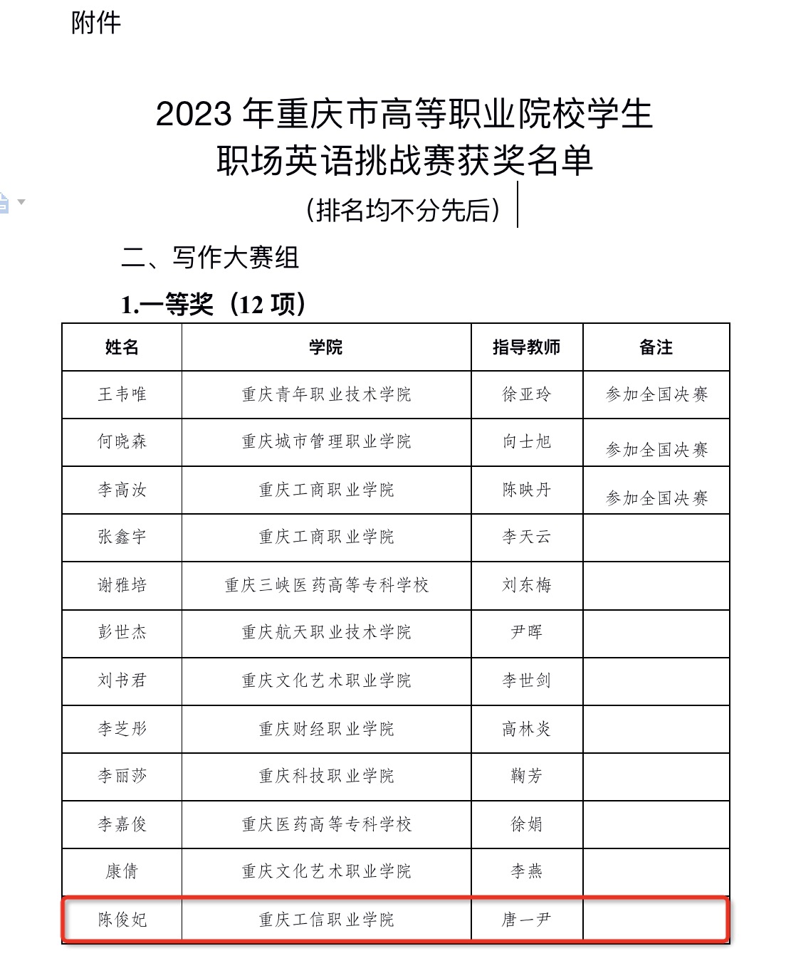2023年11月18日,重庆市高等职业院校学生职场英语挑战赛在重庆城市管理职业学院成功举办,全市共有43所高职院校(含职业本科)的181支参赛队伍参与。经过激烈的竞争,我校药品生物技术专业23级学生陈俊妃荣获写作大赛一等奖,智能控制技术专业22级学生彭秀月获得三等奖,铁道信号自动控制专业23级学生肖洁在演讲大赛中获得三等奖。