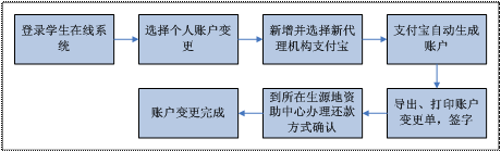 1、变更还款方式。贷款学生登陆国家开发银行生源地助学贷款学生在线服务系统https://sls.cdb.com.cn,选择类型“生源地助学贷款”使用身份证登陆(登陆初始密码为身份证上出生日期,如:19900101,登录后请及时修改,并牢记修改后密码),登陆后点击“个人账户变更”—“新增”,新代理机构选择“支付宝”后提交,支付宝账户由系统受理后自动生成。