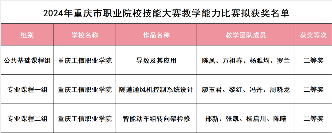 在刚刚揭晓的2024年职业院校技能大赛教学能力比赛获奖名单中,我校再创佳绩,通识学院陈凤、万祖春、杨雅均、罗兰团队,智能制造学院廖玉君、黎红、冯丹、周晓龙团队,轨道交通学院的邢新、张凯、杨启川、陈曦团队,分别荣获高职公共基础组、专业课程一组、专业课程二组团体二等奖。作为一所新办高职院校,此次比赛我校三支队伍全部进入决赛并获得历史最好成绩,充分彰显了我校教师的综合素养与学校的办学实力。
