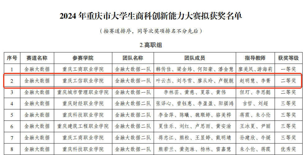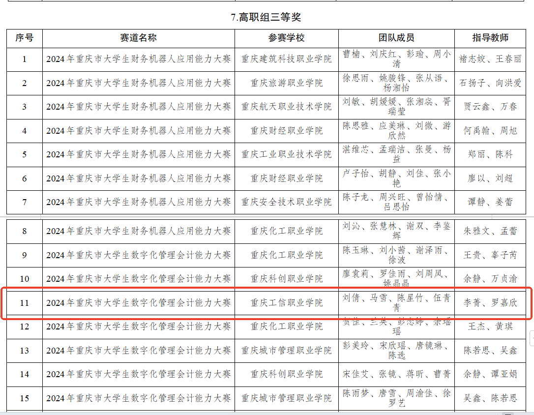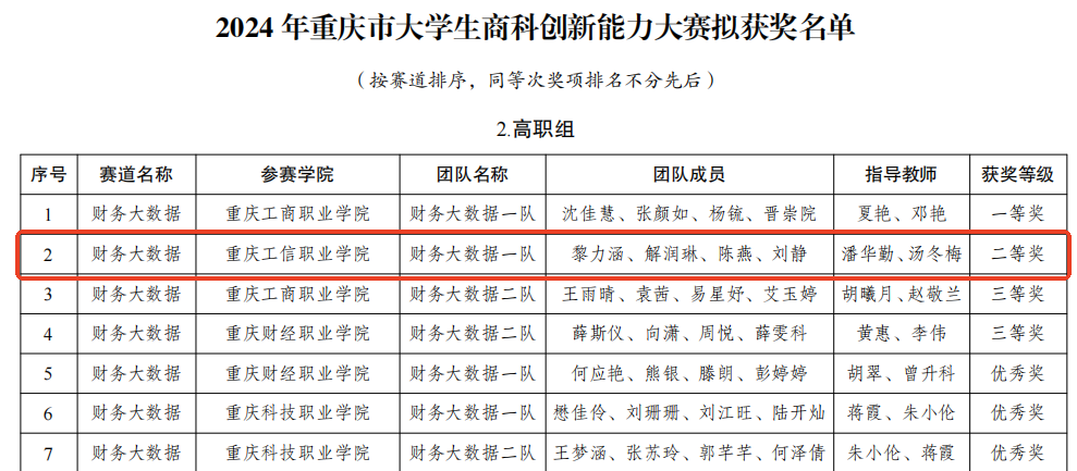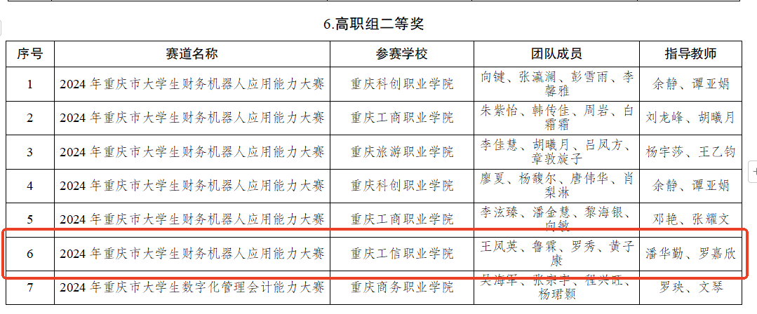 在由重庆市教育委员会主办的2024年重庆市大学生学科竞赛中,我校现代服务学院四支参赛队全部载誉而归。学生在财务大数据赛道获得二等奖,金融大数据赛道获得二等奖,财务机器人应用能力赛道获得二等奖,数字化管理会计能力赛道获得三等奖。