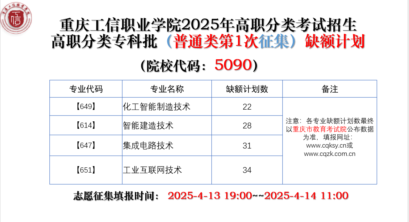 重庆工信职业学院2025年高职分类考试招生(普通类第1次征集)缺额计划