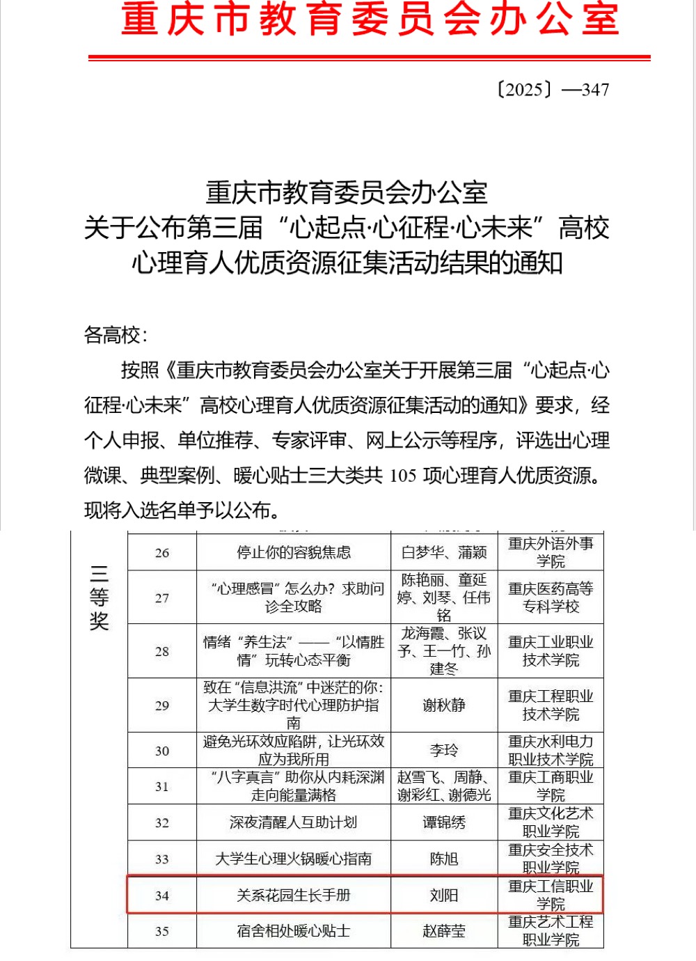 近日,重庆市教委公布了2025年“心起点·心征程·心未来”高校心育优质资源征集活动获奖名单,我校马克思主义学院教师刘阳荣获暖心贴士类三等奖。