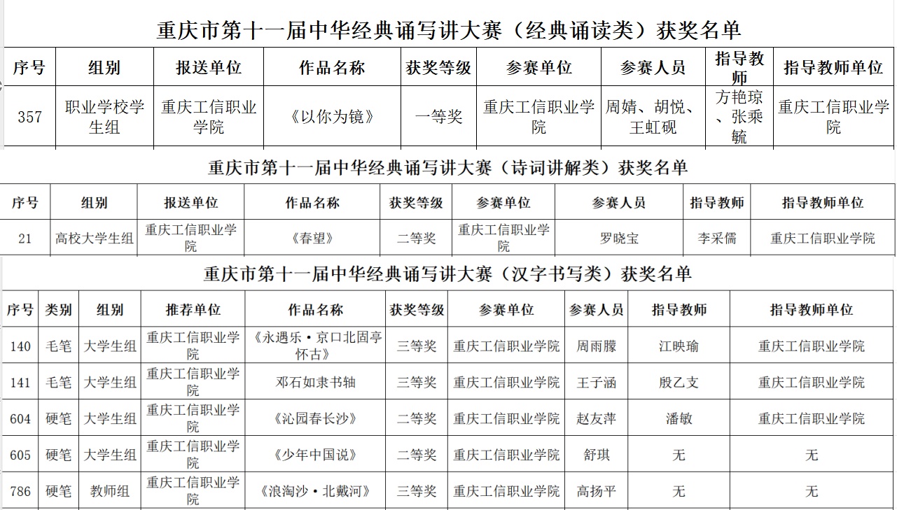 近日,重庆市第十一届中华经典诵写讲大赛圆满落下帷幕。我校成绩斐然,斩获一等奖1项,二等奖3项,三等奖3项,实现了我校在该系列赛事中获奖级别和获奖总数的新突破。我校也荣获“成绩突出单位”,是获此殊荣的全市八所高等院校之一。其中三个作品进入全国决赛,分别是经典诵读类周婧、胡悦、王虹砚同学作品《以你为镜》,诗词讲解类罗晓宝同学作品《春望》,汉字书写类硬笔赵友萍同学作品《沁园春长沙》。