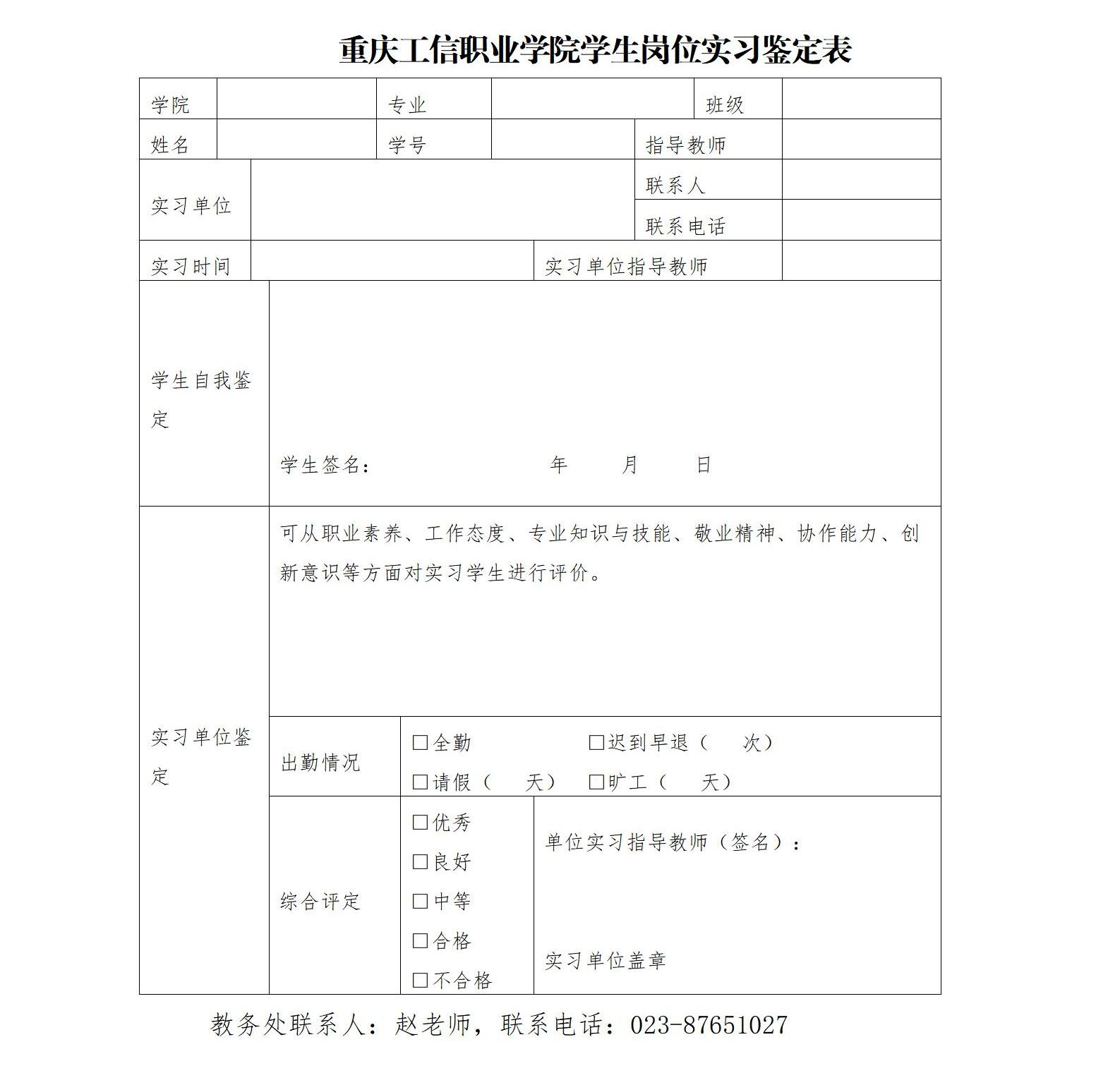 特别说明:因学校岗位实习管理办法印发时间早于习讯云管理平台部署时间,岗位实习管理办法中对实习总结和实习单位鉴定的表格较复杂,不便于平台上传,学校对此部分做了简化处理,因此请各位同学统一按照附件《重庆工信职业学院岗位实习鉴定表》的格式提交实习单位鉴定表;若已按照办法中的附件提交了实习单位鉴定的同学,无需再按新表提交。