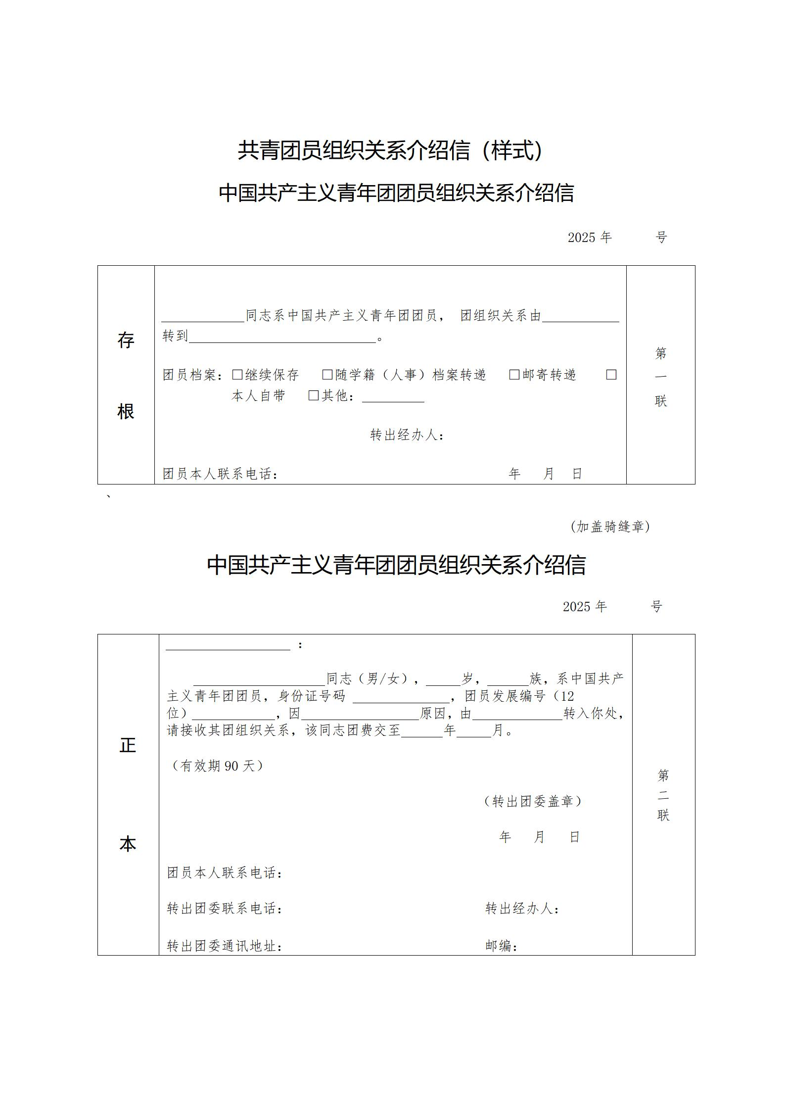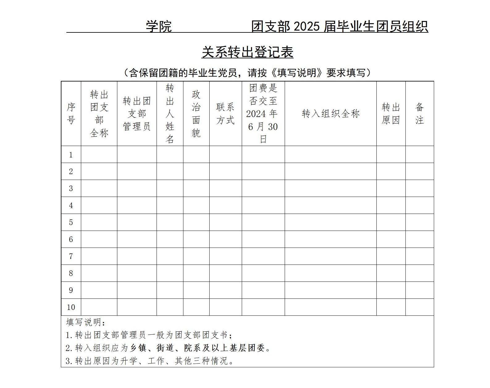 ①各团支部要做好2025届毕业年级团员团组织关系转接信息统计。填写《2025届毕业年级团员团组织关系转出登记表》(附件2),确保信息准确。以便后续的团组织关系转接、开具团组织关系介绍信(如接收单位需纸质版介绍信,参考附件3)等事宜。