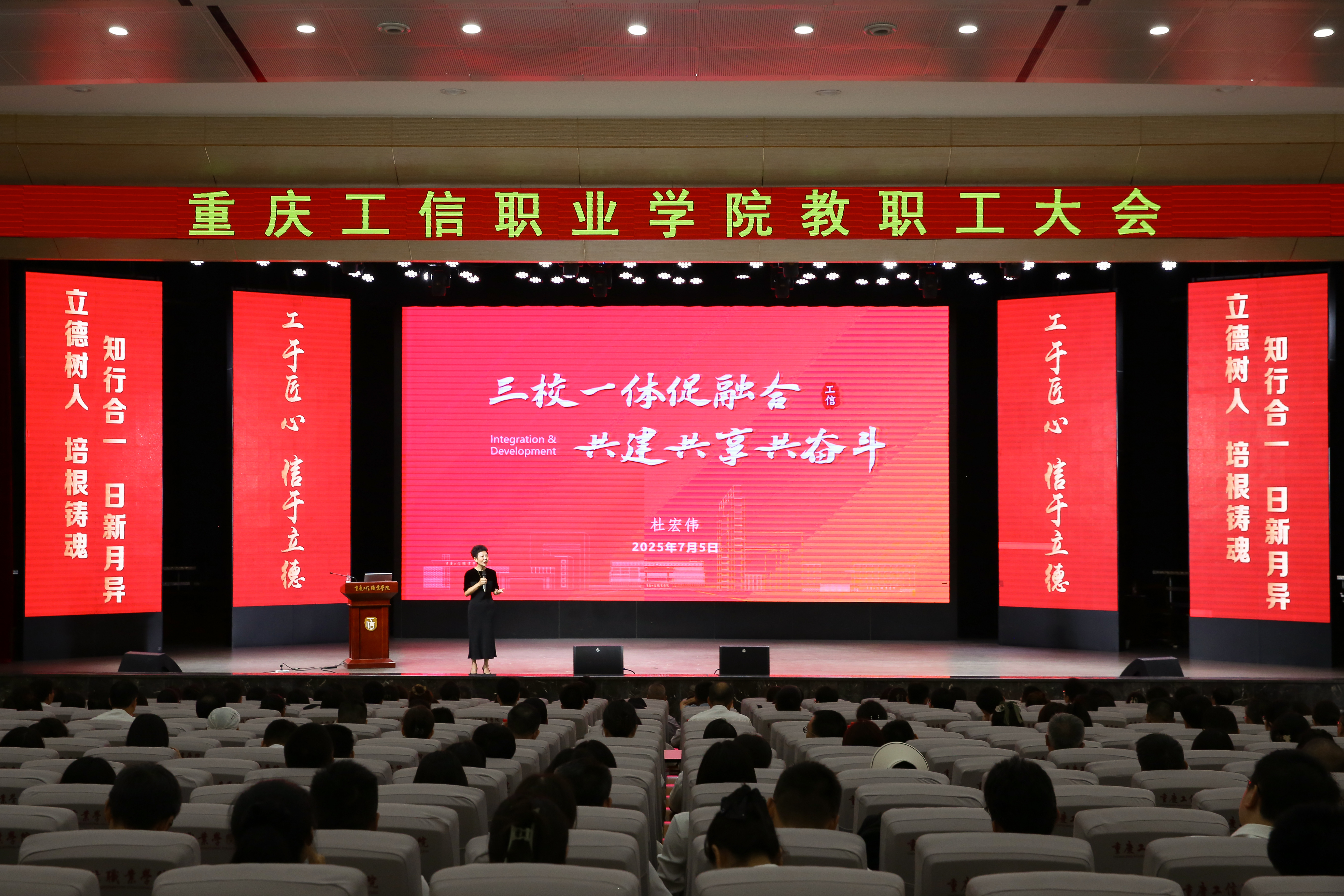 会上,党委副书记、院长杜宏伟以《三校一体促融合 共建共享共奋斗》为题,系统梳理三校融合发展的奋进历程。从“五统三转四同”机制的初创探索,到实现长寿、渝中、沙坪坝三校区功能定位的系统性重构,她以“中职教育向高职教育转型”“三校四点整合管理体系搭建”等关键突破为脉络,用详实数据与鲜活案例还原了融合进程中的攻坚场景。这些凝结着集体智慧的奋斗历程,以可视化的历史切片形式,为全校教职工展开了一幅从多点办学到一体化发展的立体画卷,让“工信人”的共同体意识在回溯中愈发坚实。