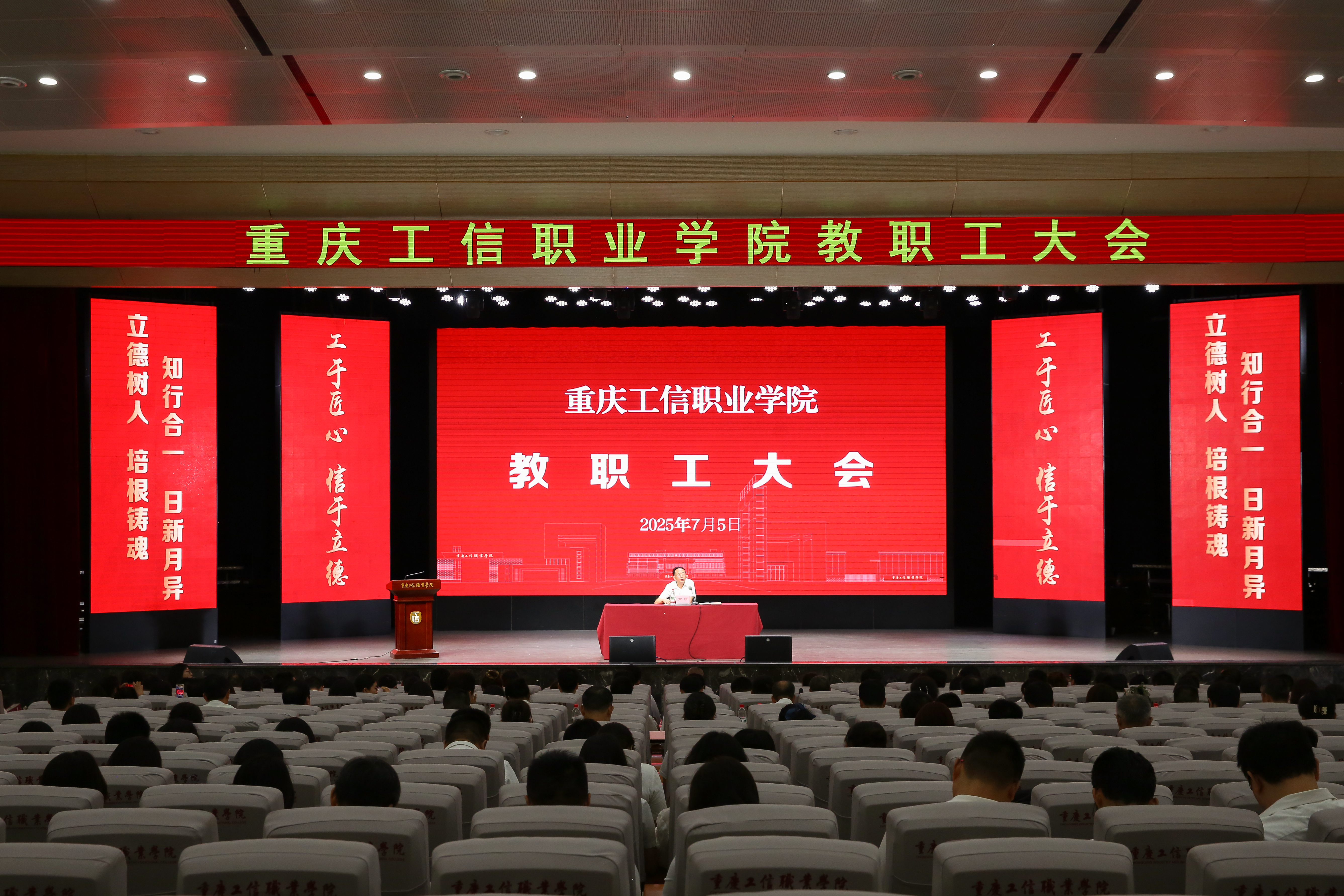 7月5日,重庆工信职业学院在渝中校区召开春季学期期末教职工大会。会议全面传达学院第一次党代会精神,系统总结三校融合发展实践成果,安排当前和今后一个时期的重点任务,为建设特色鲜明的高水平职业院校凝聚奋进力量。党委书记高明,党委副书记、院长杜宏伟出席会议并讲话,党委副书记吴瑶主持会议,校领导、全校教职工参会。