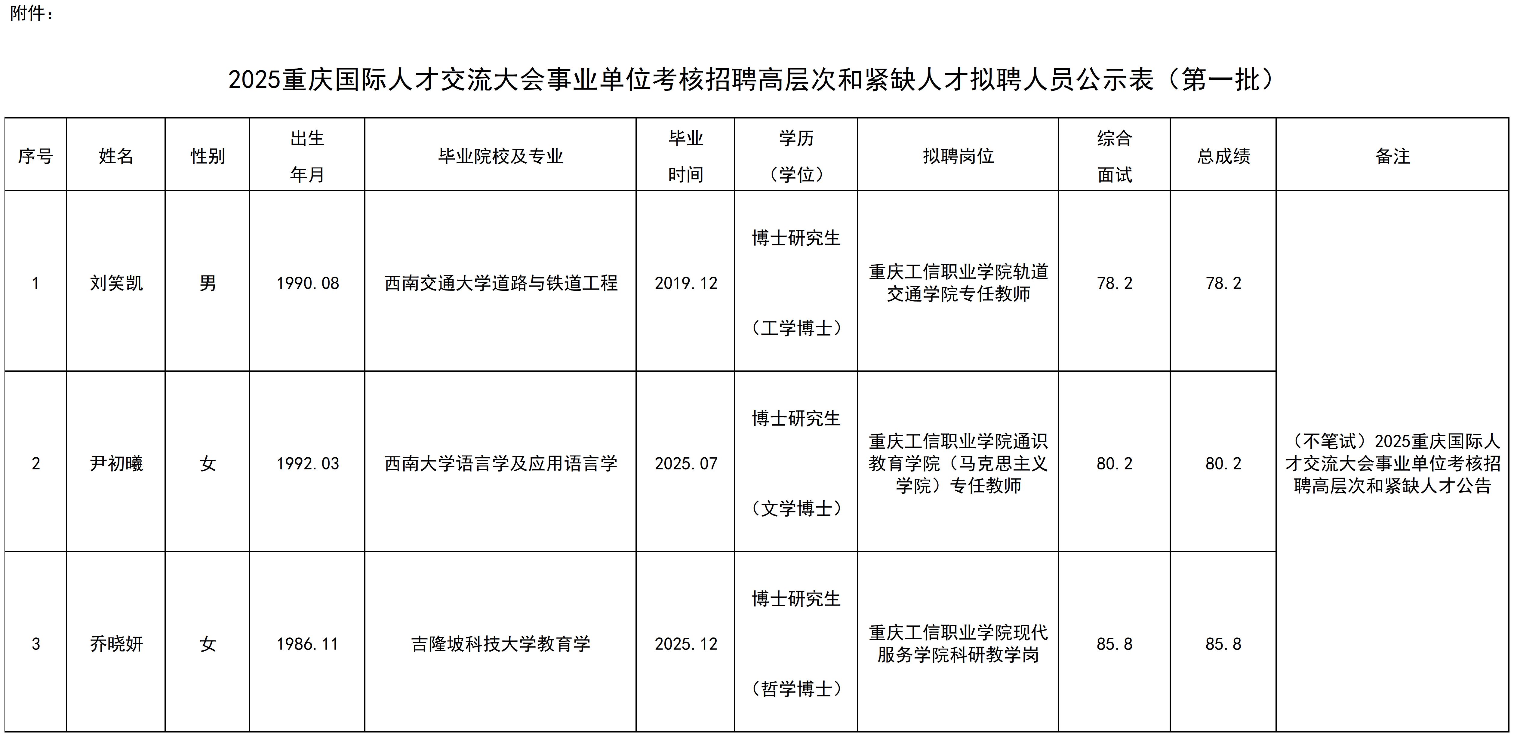 根据《关于进一步做好事业单位公开招聘有关工作的通知》(渝人社发〔2023〕72号)等规定,按照重庆市人力资源和社会保障网(rlsbj.cq.gov.cn)2025年10月21日发布《2025重庆国际人才交流大会事业单位考核招聘高层次和紧缺人才公告》确定的程序,现将3名拟聘人员予以公示。