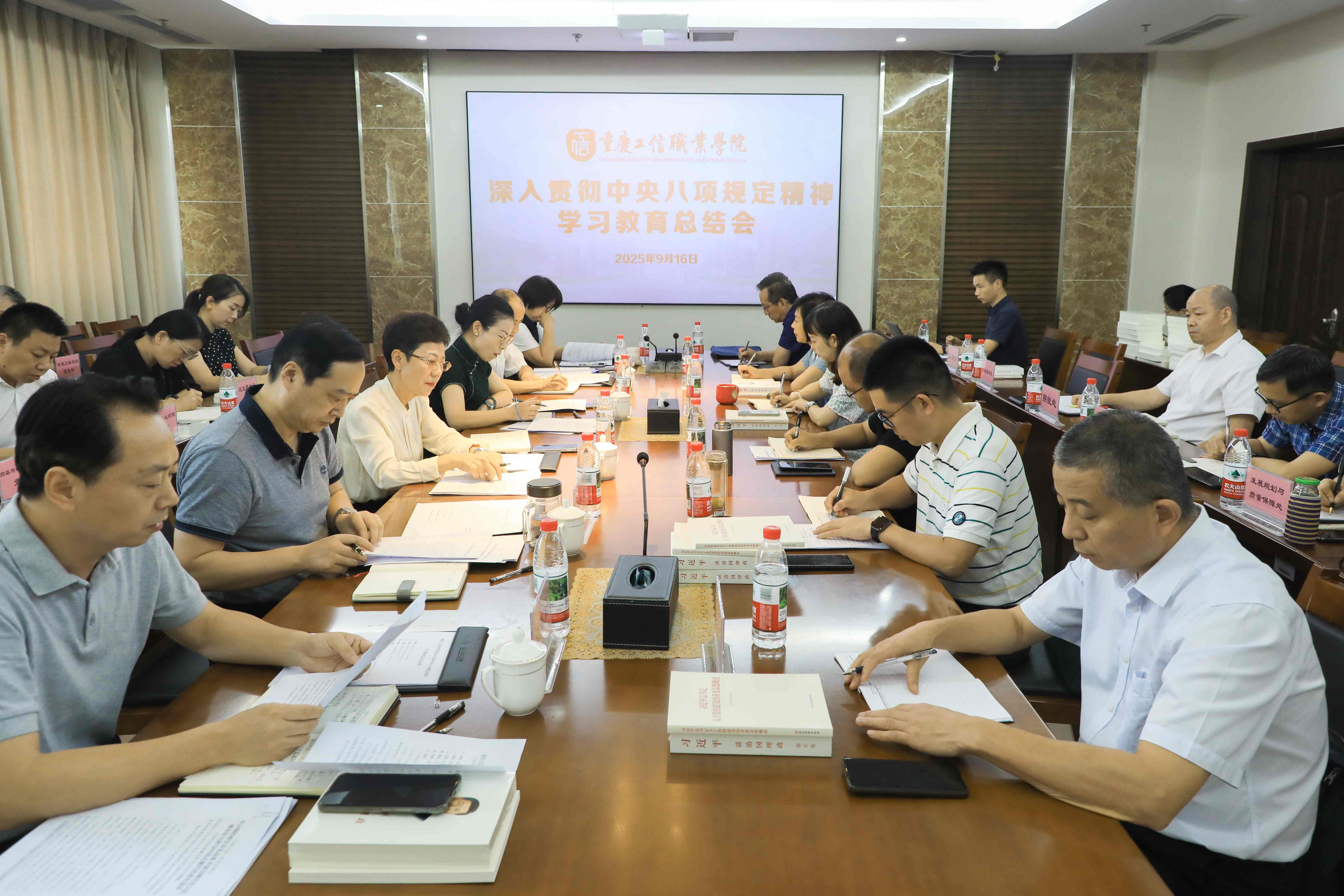 9月16日,重庆工信职业学院召开深入贯彻中央八项规定精神学习教育总结会议,认真学习贯彻习近平总书记关于深入贯彻中央八项规定精神学习教育的重要指示精神,传达学习中央党的建设工作领导小组会议精神以及市委常委会会议精神和市经济信息委党组扩大会议精神,总结学校学习教育成效,部署巩固拓展学习教育成果,推动作风建设常态化长效化。党委副书记吴瑶主持会议并讲话。会议指出,学校自开展深入贯彻中央八项规定精神学习教