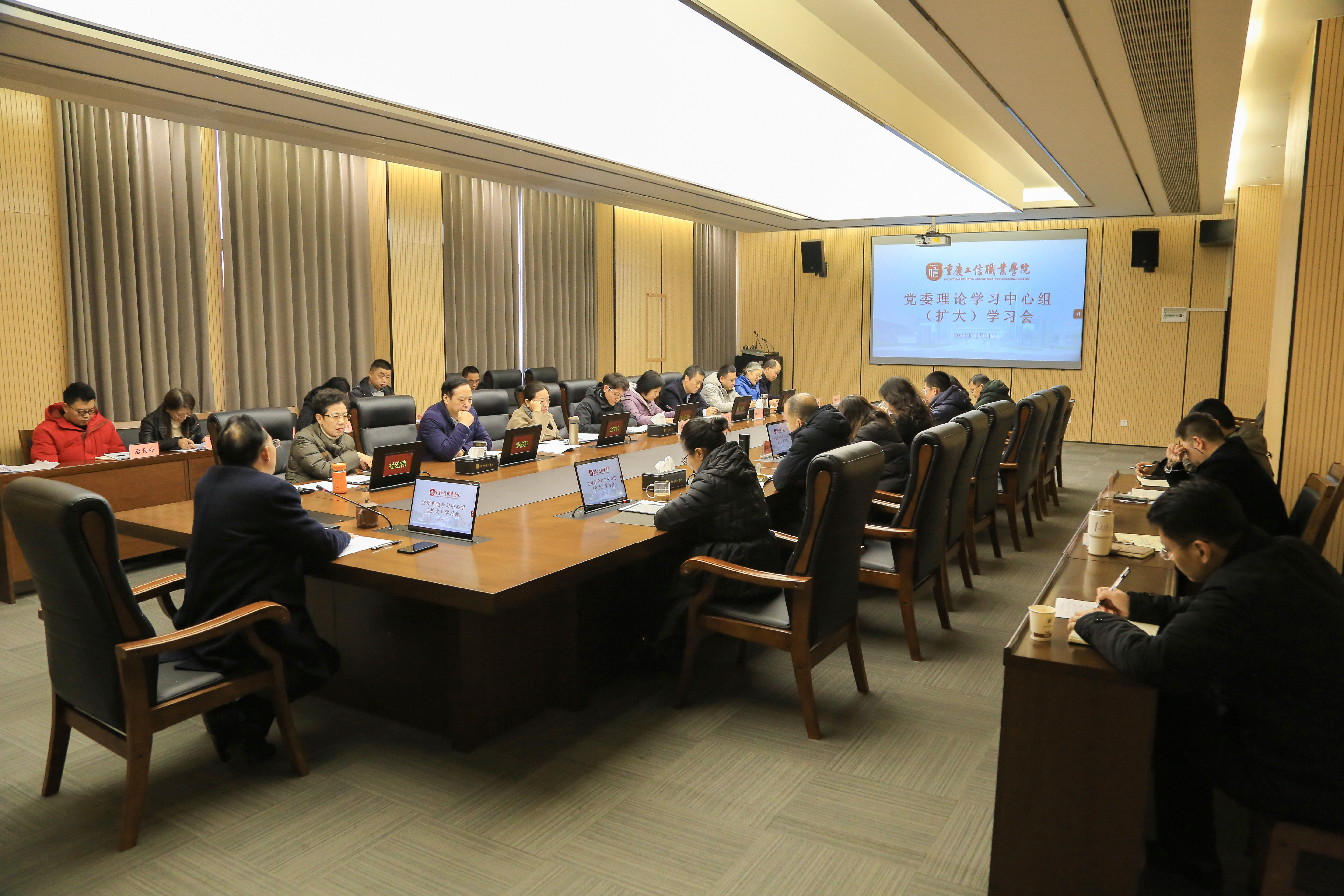 2024年12月24日,重庆工信职业学院党委理论学习中心组举行2024年第11次学习研讨活动,会议由学院党委书记高明主持,全体党委委员、二级学院及部门负责人参会。会议深入学习了重庆市委常委会扩大会议精神,重点传达了中央经济工作会议精神。会议指出,深刻领会党中央对经济工作的决策部署意义重大,学院应突出稳增长促发展导向,结合自身优势,科学谋划发展目标,积极争取政策支持,为推动学院高质量发展奠定基础。