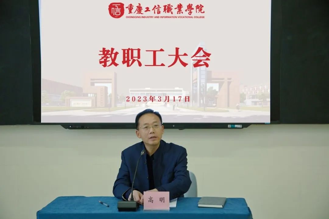 3月10日下午,重庆工信职业学院党的二十大精神宣讲报告会暨开学第一课在广知楼2207会议室开讲。会议由院长杜宏伟主持,党委书记高明主讲,全校教职工、部分学生代表参会。高明书记以“全面学习贯彻党的二十大精神,奋力书写中国式现代化工信答卷”为主题,带领大家再次深入学习领会党的二十大精神,结合全市教育工作要点和学校建设发展实际,为工信答卷的书写指明了方向和路径。杜宏伟院长在主持会议时强调,希望全校教职